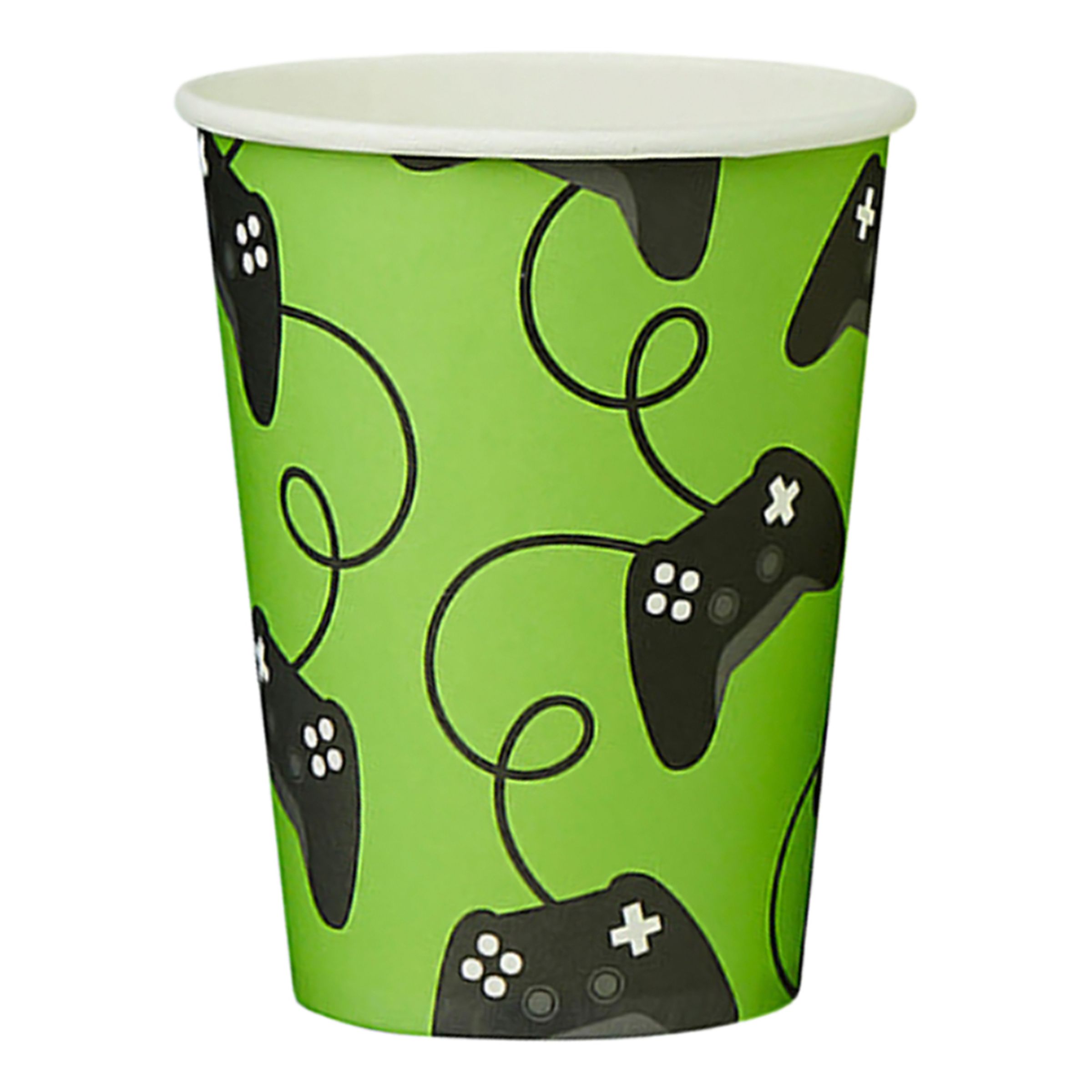 Pappersmuggar Gamer innehåller 8 stycken gröna muggar som pryds av svarta handkontroller. Ett måste när det vankas fika på födelsedagskalaset när det är en liten gamer som ska firas!