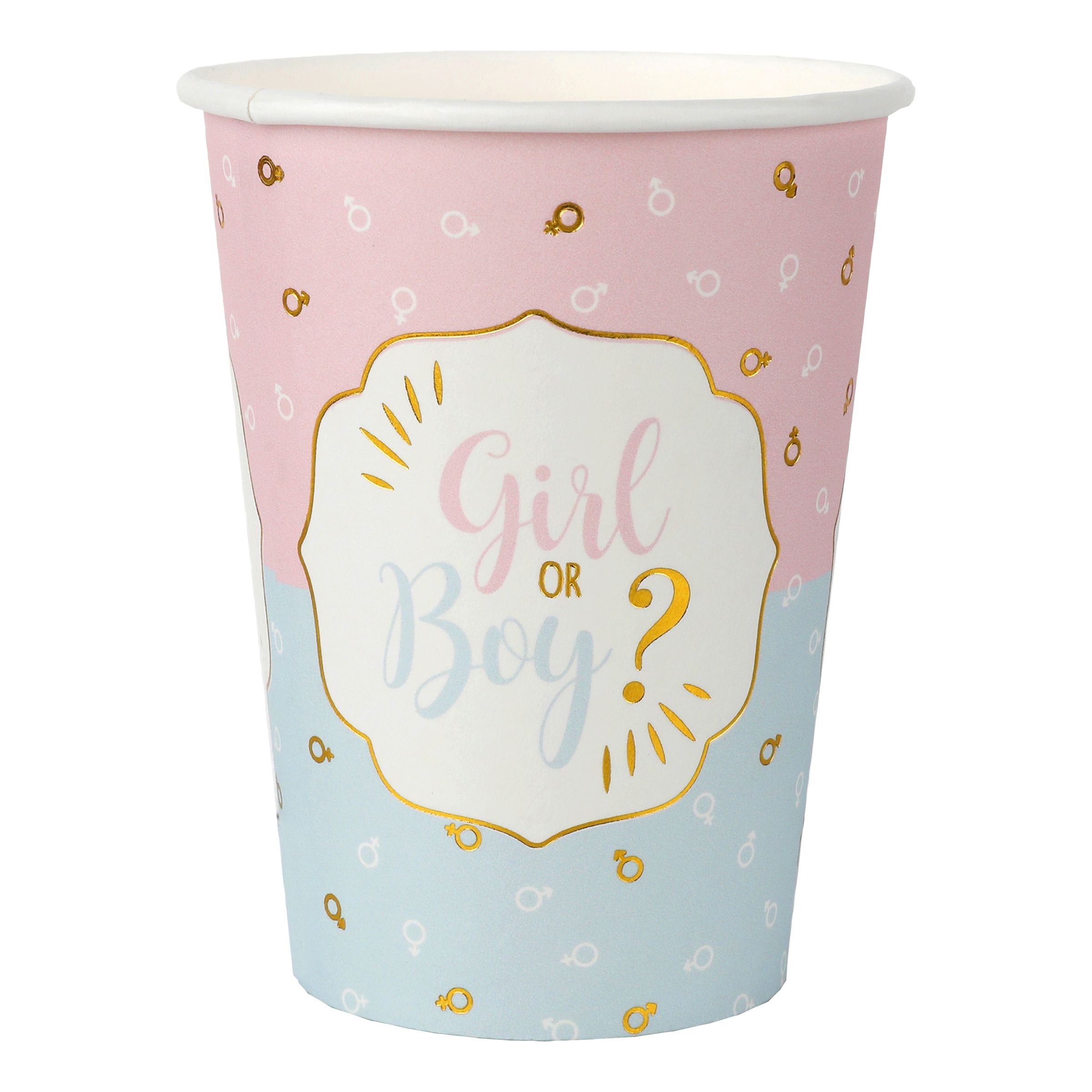 Pappersmuggar Girl or Boy är en superfin mugg där den undre halvan är blå och den övre halvan är rosa med texten "Girl or Boy?" i mitten. Passar perfekt till Baby Showern eller Gender Reveal. Matcha tillsammans med produkter ur vårt sortiment med samma tema för att få en enhetlig look!