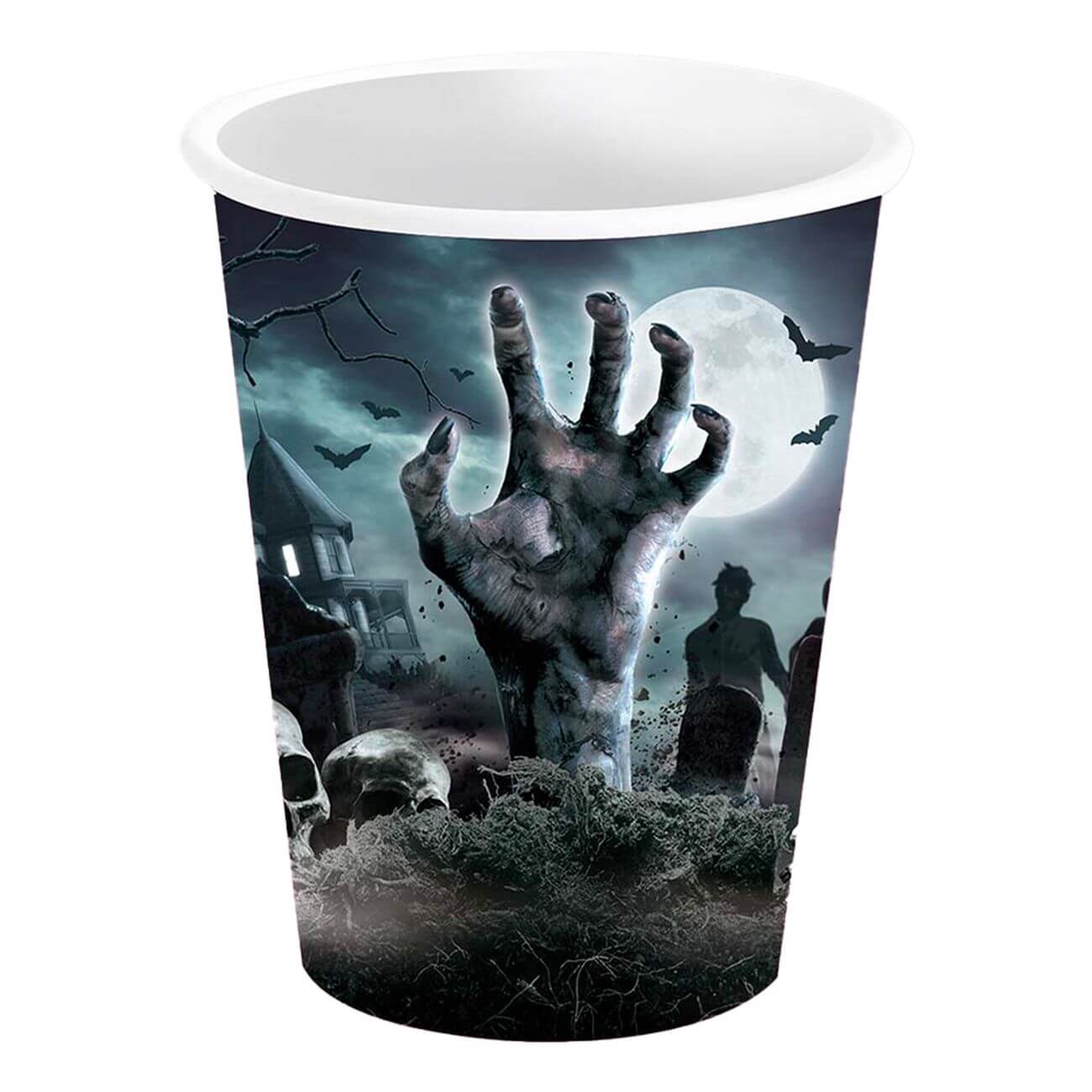 Pappersmuggar som är perfekta till Halloweenfesten. De har tryck av läskig kyrkogård med zombies och en hand som kommer upp ur jorden. Går även bra att använda för lägga upp godsaker i. Matcha gärna med andra produkter i samma serie.