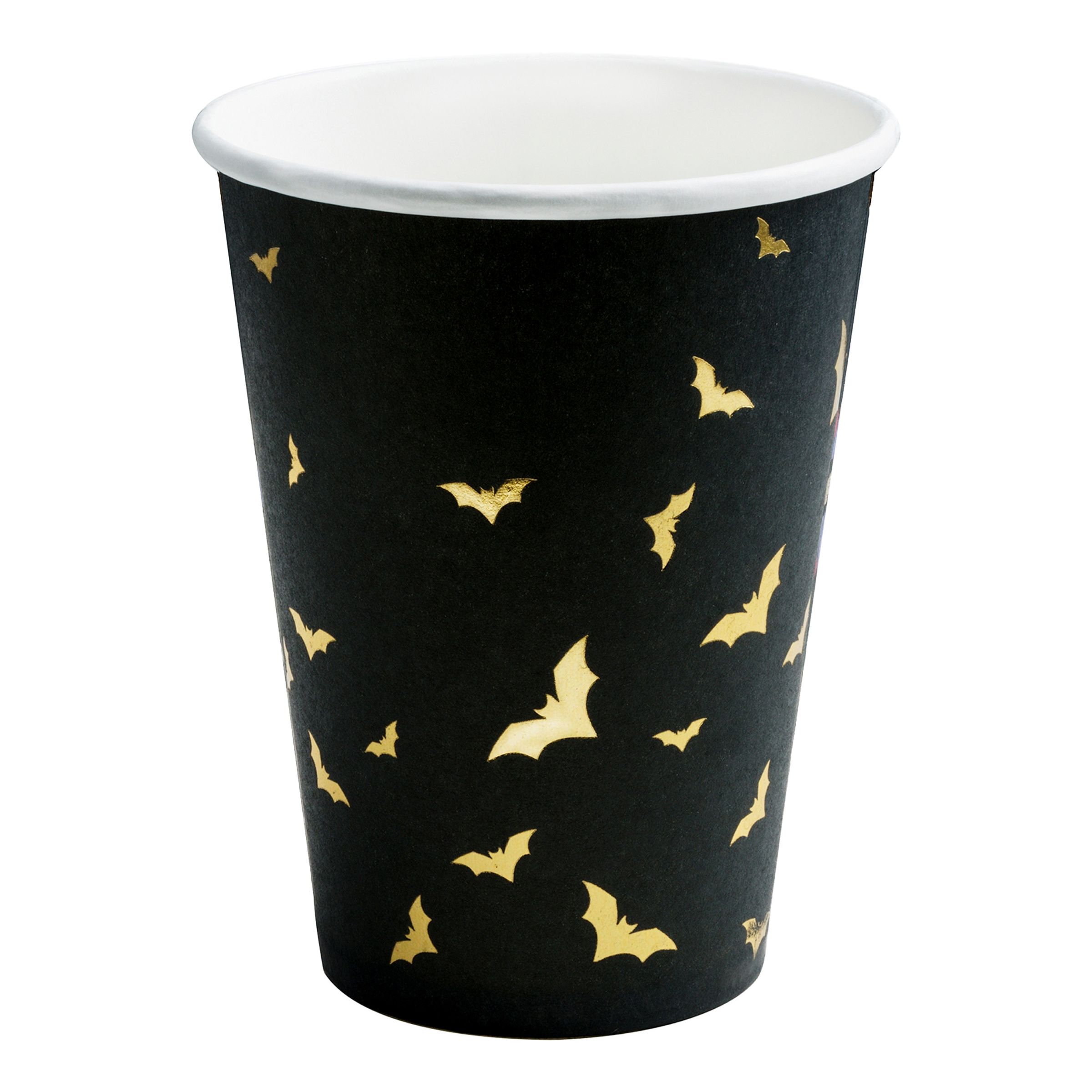 Pappersmuggar Halloween Trick or Treat innehåller 6 stycken engångsmuggar i papper som alla pryds av guldiga fladdermöss mot svart bakgrund. Perfekt på halloweenfester och läskiga kalas!