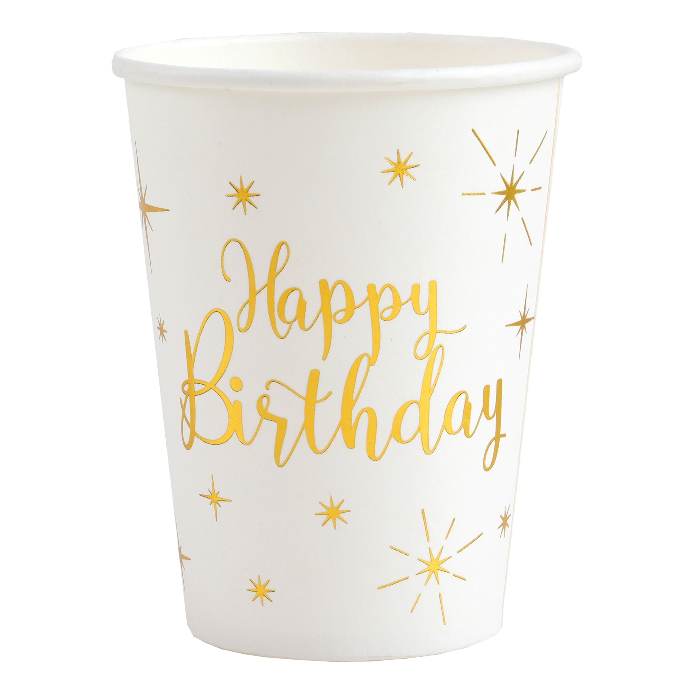 Pappersmuggar Happy Birthday Vit/Guld är pappersmuggar i vit och guld som gör sig fin till födelsedagen! Matcha med dukning som går i samma tema för att få ett enhetligt resultat. Perfekt till kalaset!