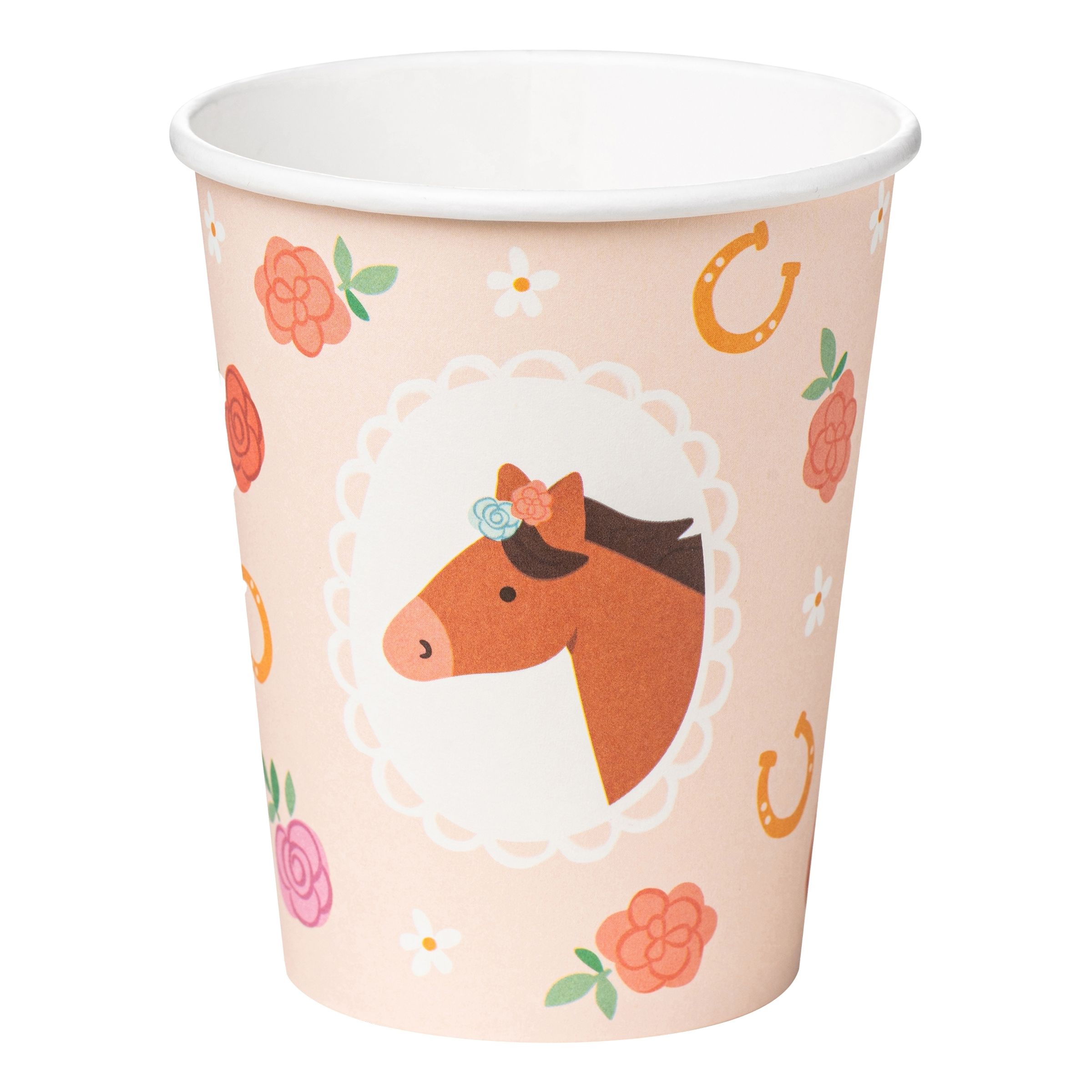 Pappersmuggar Hästar inkluderar sex stycken engångsmuggar som alla kommer med motiv föreställande hästar, hästskor och blommor. Matcha gärna med dekorationer och annan dukning ur samma kollektion för ett komplett tema!