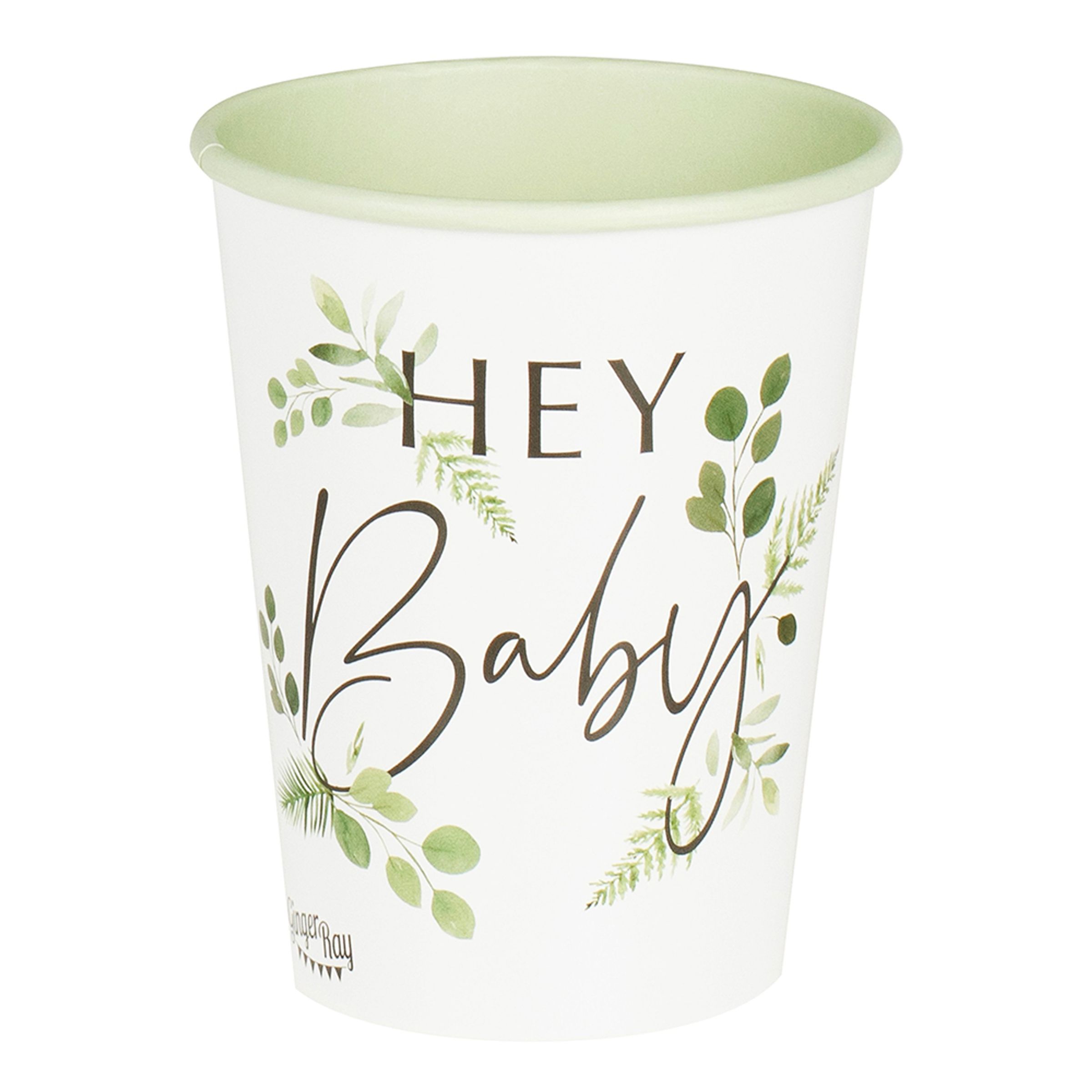 Pappersmuggar Hey Baby är engångsmuggar i vitt med gröna detaljer och texten 'Hey Baby' superfestliga! Förpackningen innehåller 8 muggar i papper vilket gör att du slipper diska efter kalasets slut.