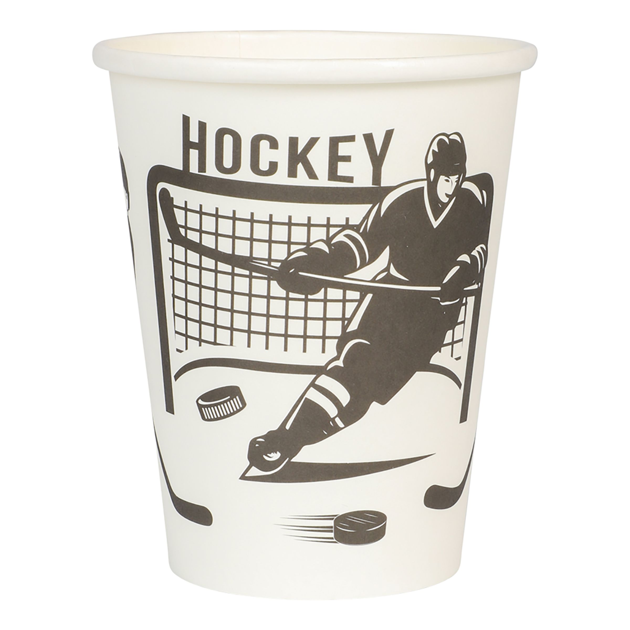 Pappersmuggar Hockey åtta stycken vita engångsmuggar som kommer med ett svart hockeymotiv föreställande en spelare på isen. Komplettera gärna med annan dukning ur samma kollektion för ett fullbordat tema på hockey-kalaset.