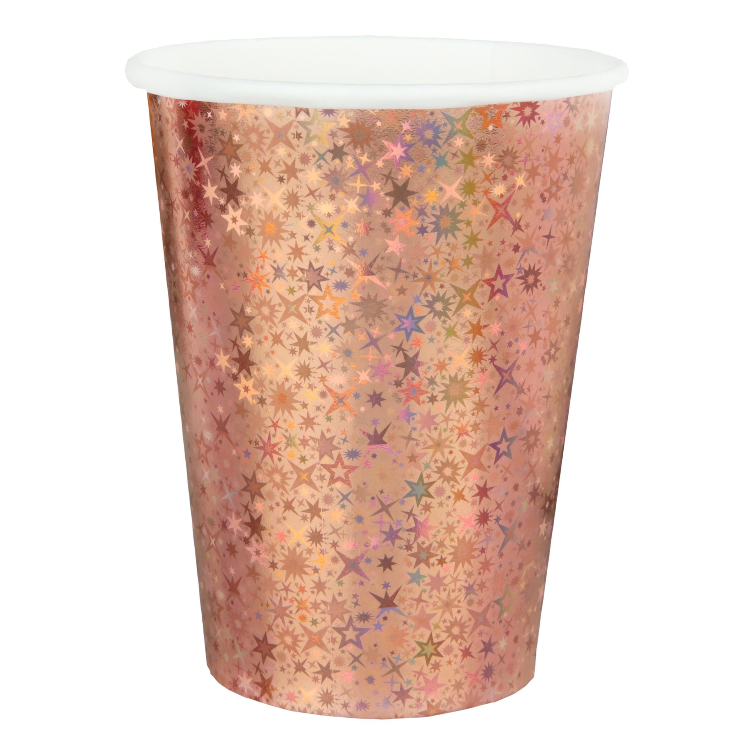 Pappersmuggar Holografisk Roséguld är engångsmuggar i roséguld. Supersnygga på det uppdukade kalasbordet. Passar lika bra till den enkla picknicken som till möhippan eller nyårsafton!