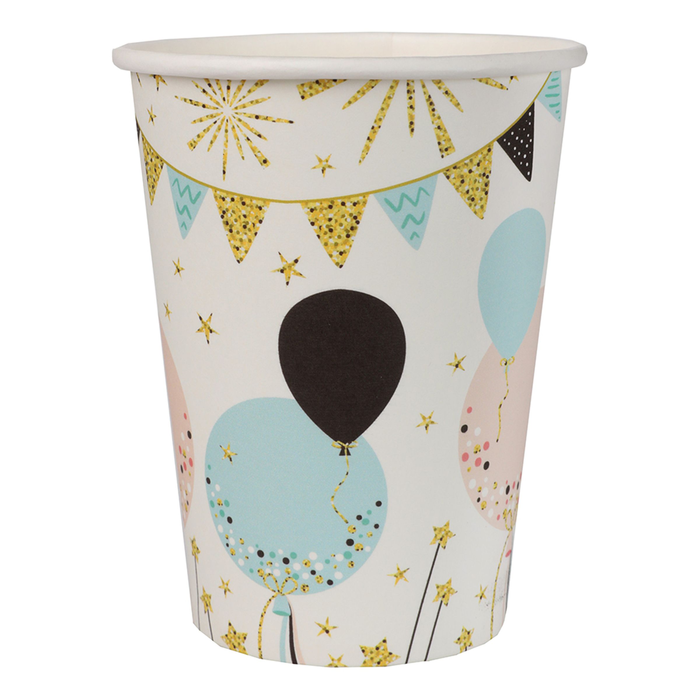 Pappersmuggar Kalas inkluderar 10 stycken pappersmuggar med härliga motiv av ballonger, girlanger och stjärnor i färgerna guld, rosa, blå och svart.