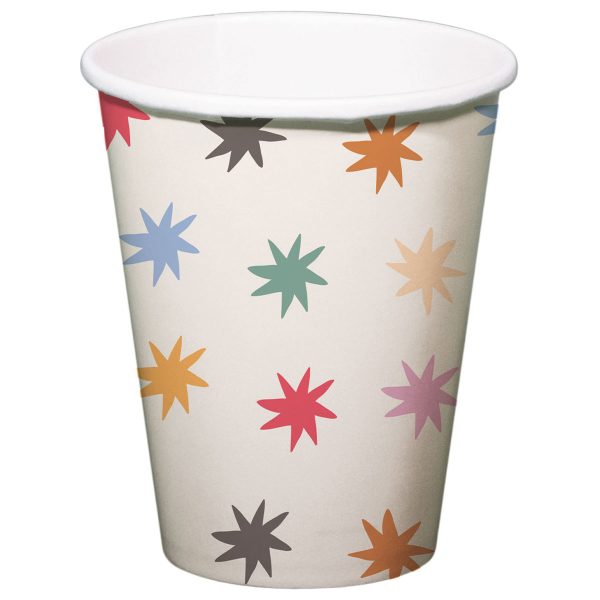 Pappersmuggar med Stjärnor 8-pack består av åtta engångsmuggar, dekorerade med stjärnor i svart, blått, grönt, orange, rött, brunt och rosa mot en vit bakgrund.