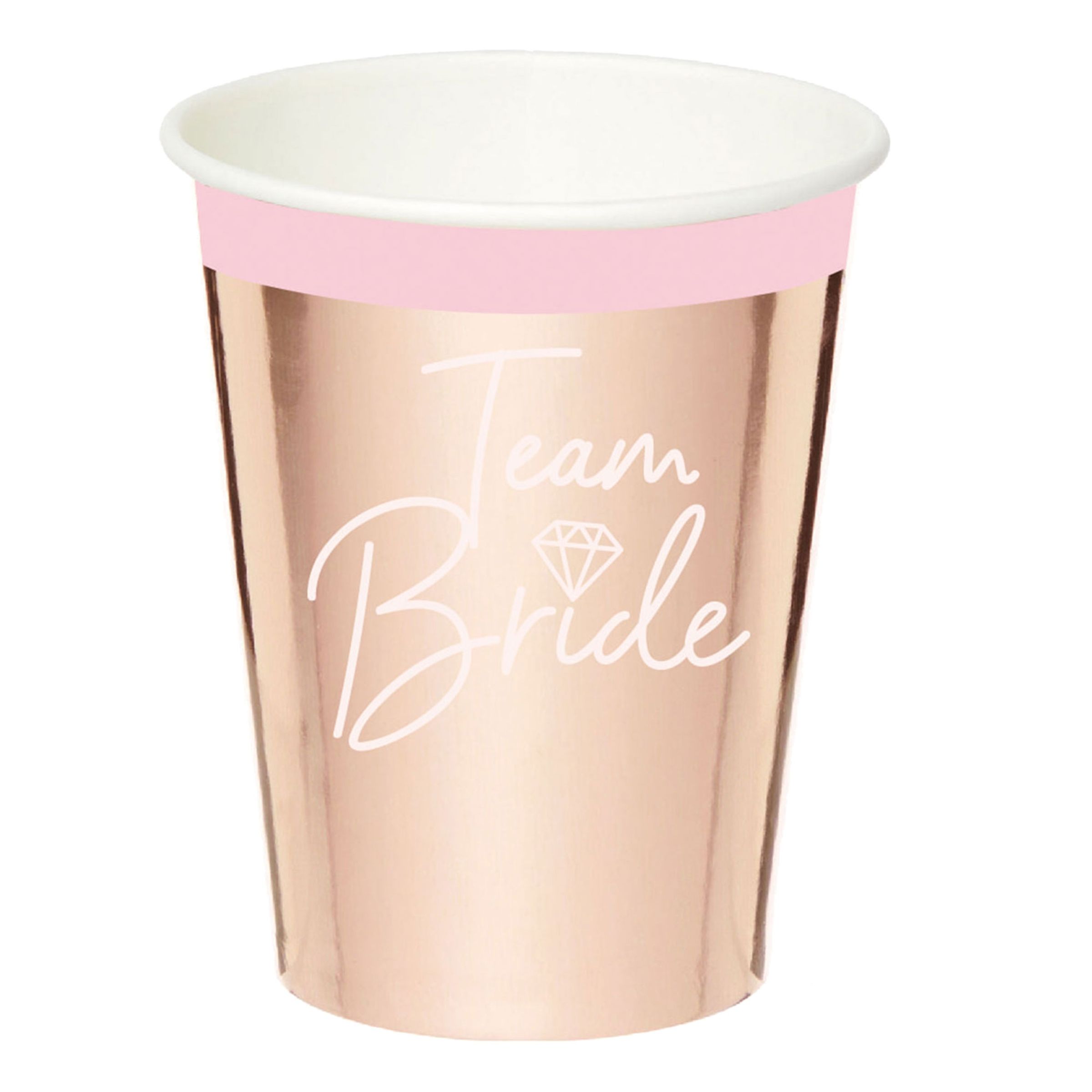 Pappersmuggar Möhippa Team Bride är tjusiga pappmuggar i skimrande roséguld med lite rosa, tryckta med "Team Bride" tillsammans med en diamant i vitt. Det givna valet av muggar till möhippan helt enkelt!