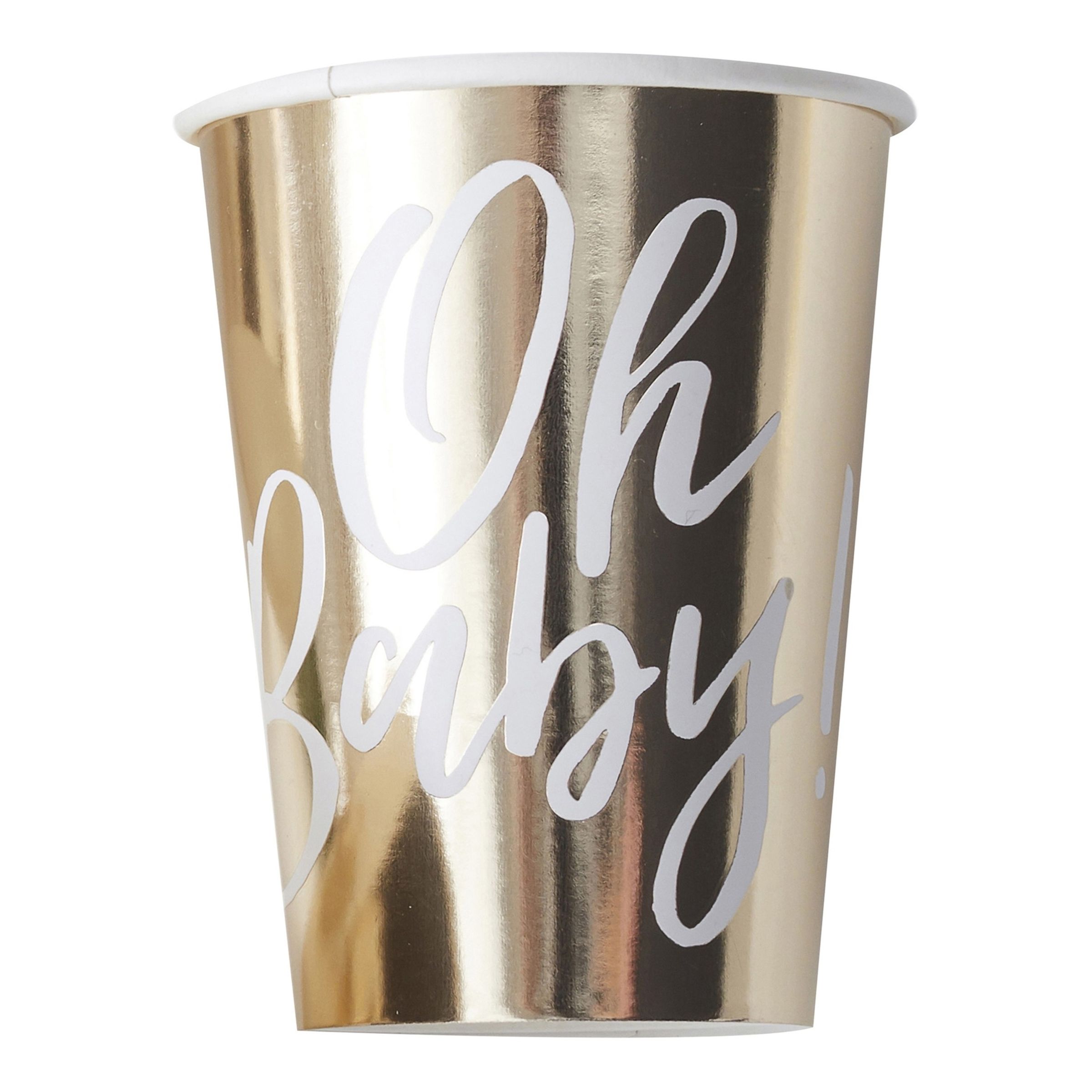 Pappersmuggar Oh baby Guld är guldiga engångsmuggar som kommer med texten "Oh baby" skrivet i vitt. Perfekt till baby shower-dukningen eller dopfesten!