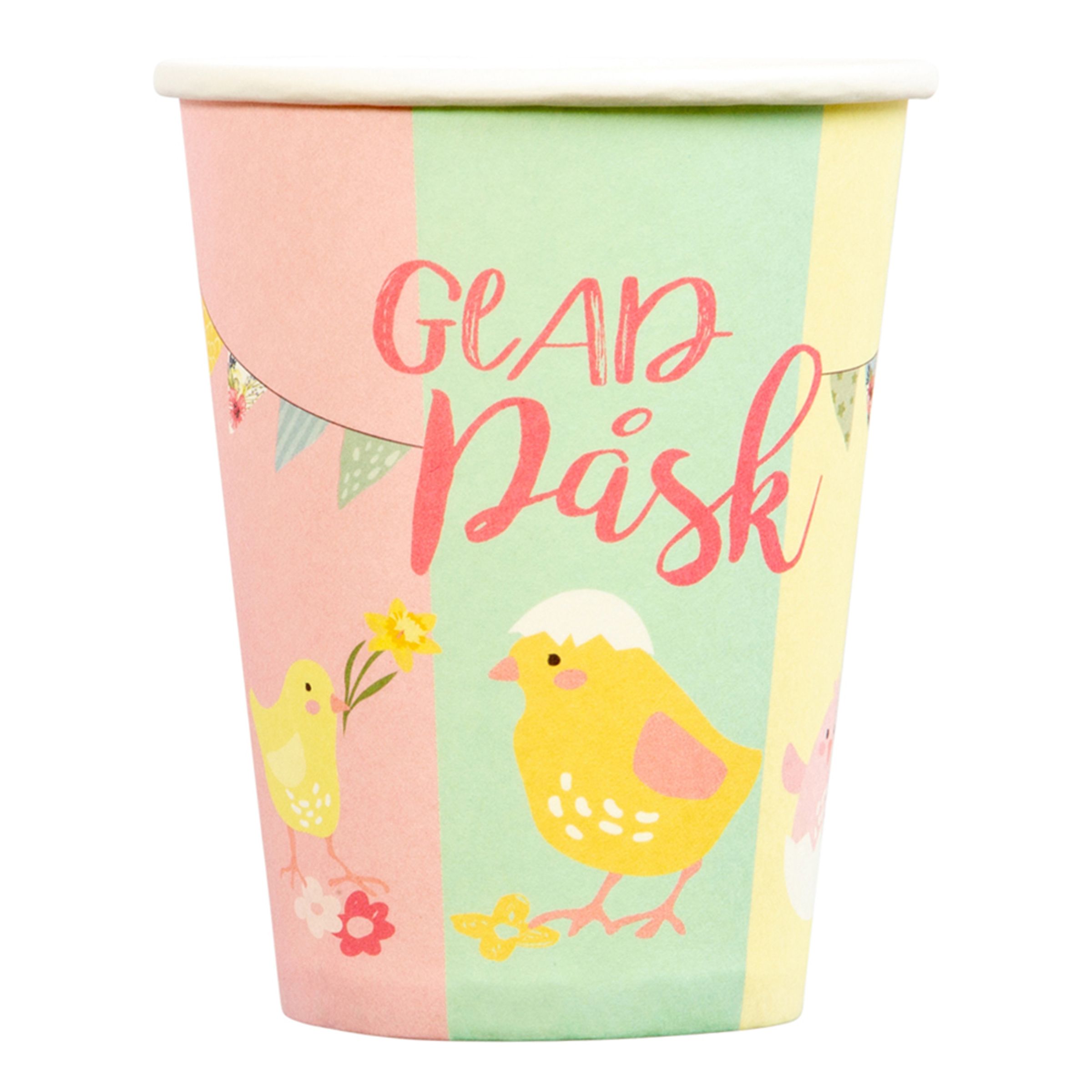 Pappersmuggar Påskkycklingar & Ägg inkluderar åtta stycken muggar i papp. Muggarna är randiga i pastellfärger och på muggarna finns ett gulligt motiv på kycklingar och blommor.