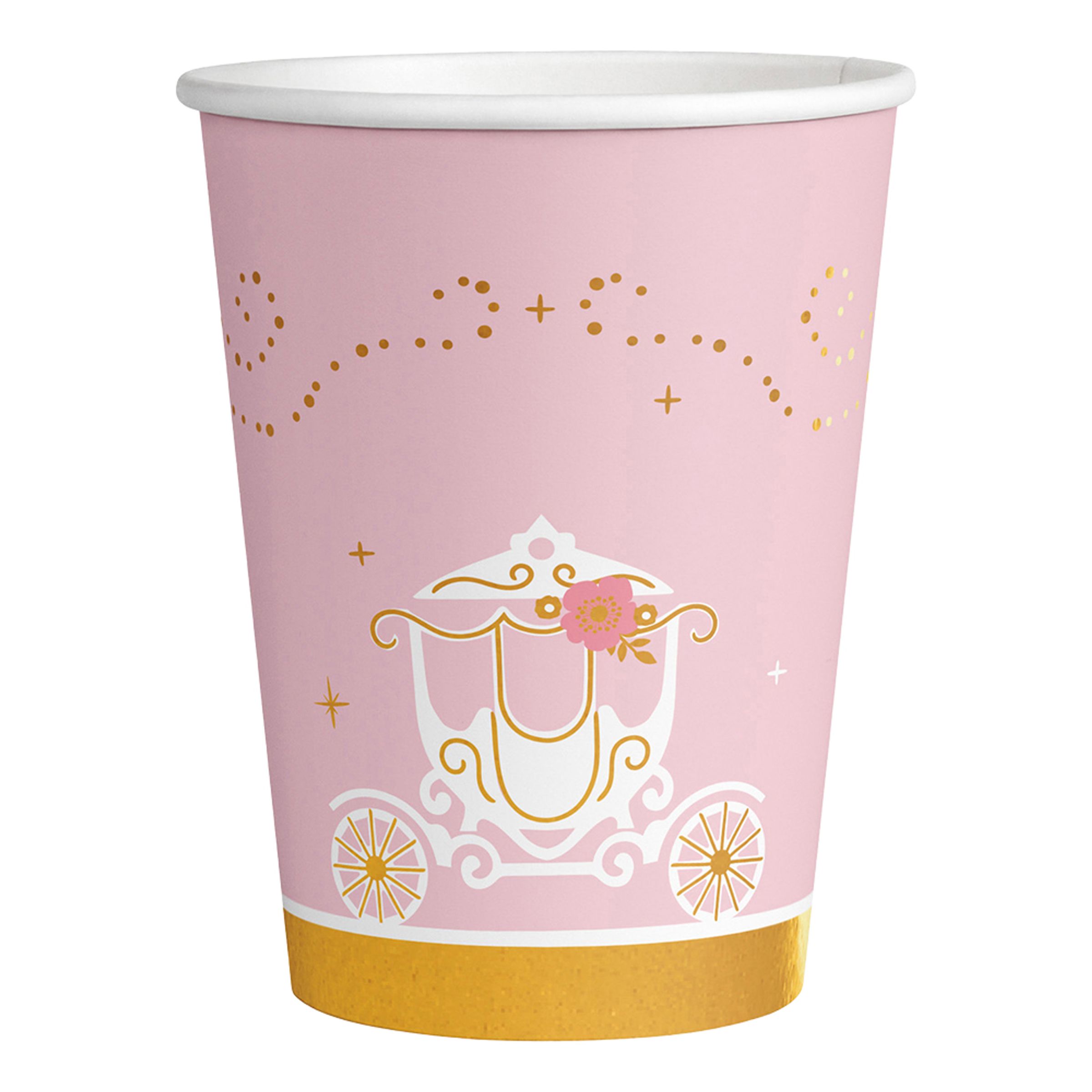 Pappersmuggar Princess for a Day inkluderar åtta stycken engångsmuggar som alla kommer med ett rosa och guldfärgat sago-motiv. Matcha gärna med annan dukning ur samma kollektion för ett fullbordat prinsesstema.