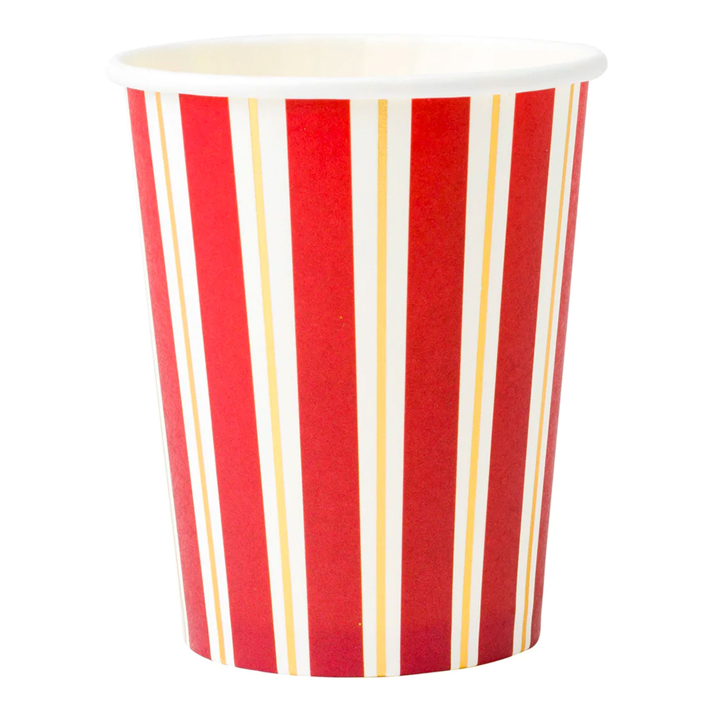 Pappersmuggar Röd/Vit Randiga är vit- och rödrandiga pappmuggar med guldfärgade linjer. Köp gärna till resterande artiklar i samma julserie för en matchande bordsdukning. Passar också perfekt till cirkuskalaset!