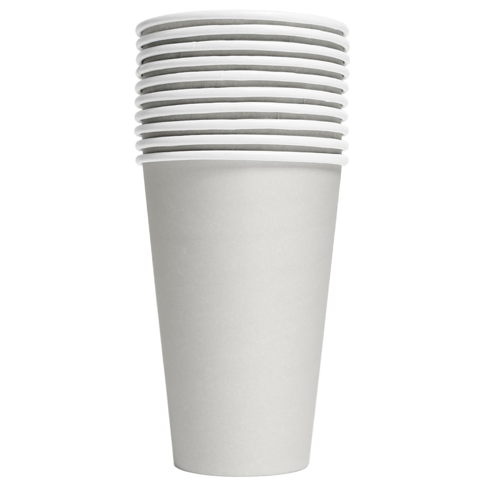 Pappersmuggar Silver 35 cl 10-pack består av tio pappersmuggar i silver.