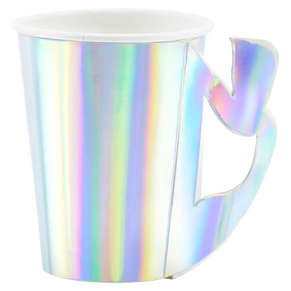 Pappersmuggar Sjöjungfrufena omfattar ett paket med 6 stycken pappersmuggar i en holografisk silverfärg som skimrar i regnbågens alla färger.