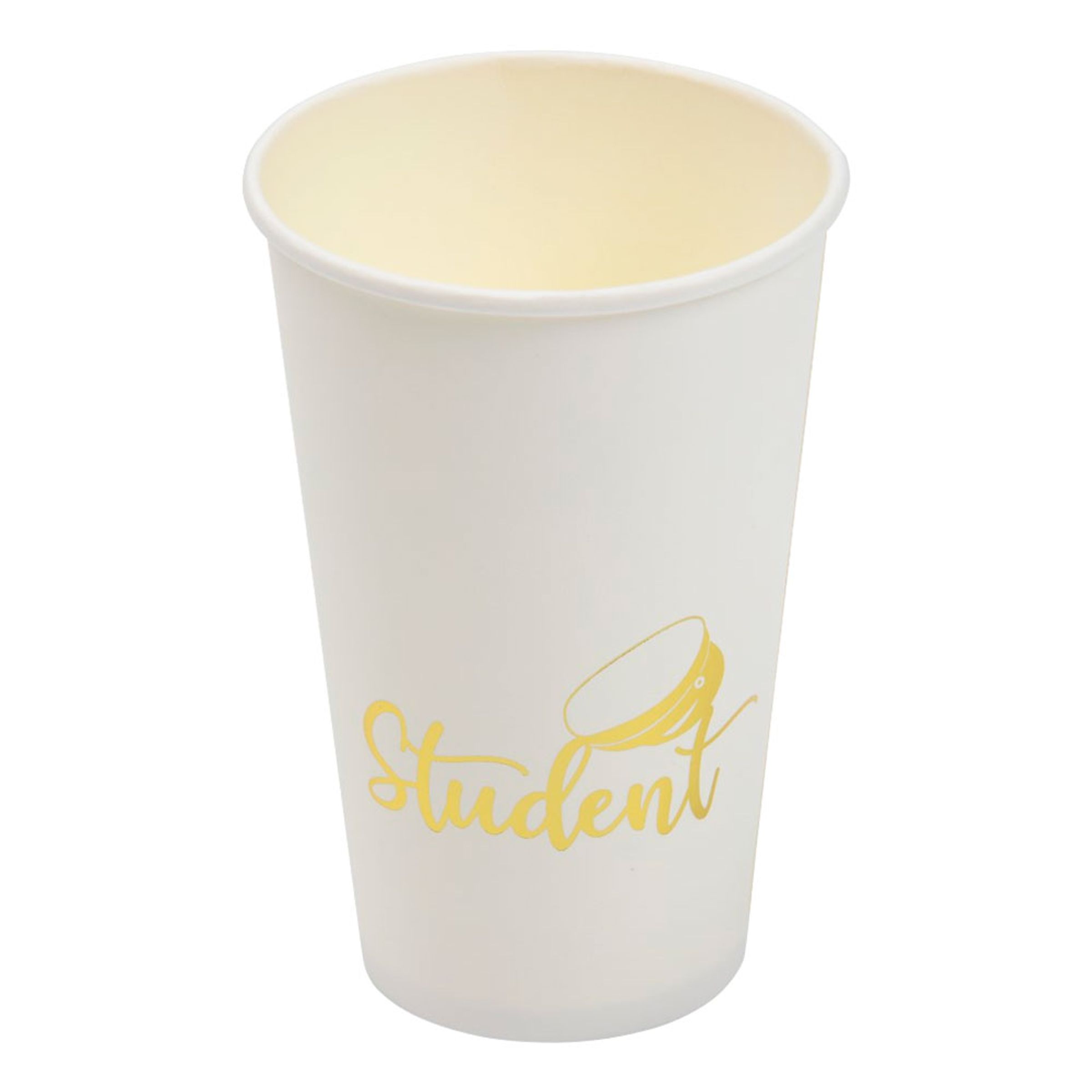 Pappersmuggar Stora Student Guld är stora vita muggar tryckta med "Student" och en studentmössa i skimrande guld. Ett givet val för en extra fin bordsdukning på studentfirandet!