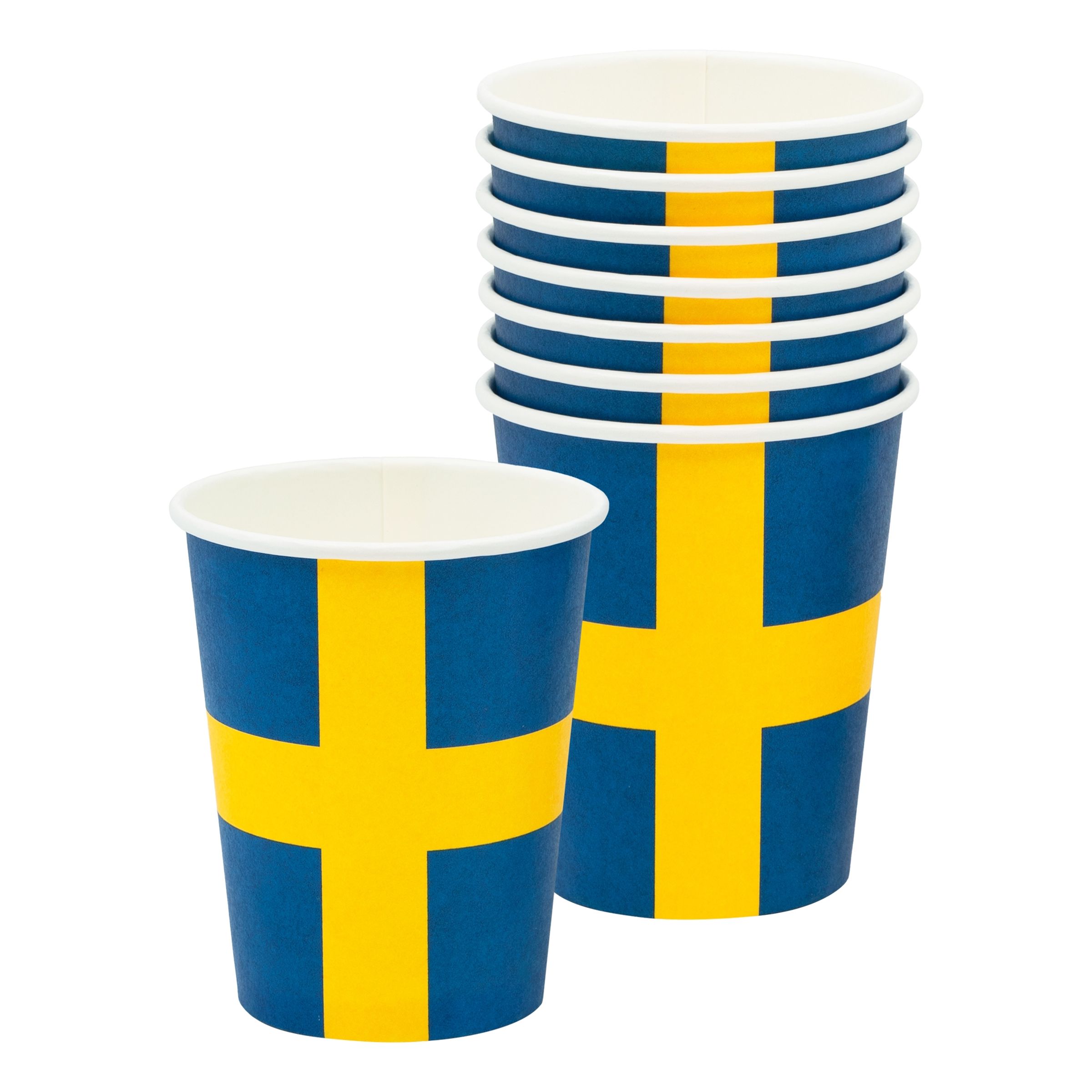 Pappersmuggar Svenska Flaggan innehåller 8 stycken pappersmuggar i blått och gult. Samtliga muggar rymmer 250 ml.