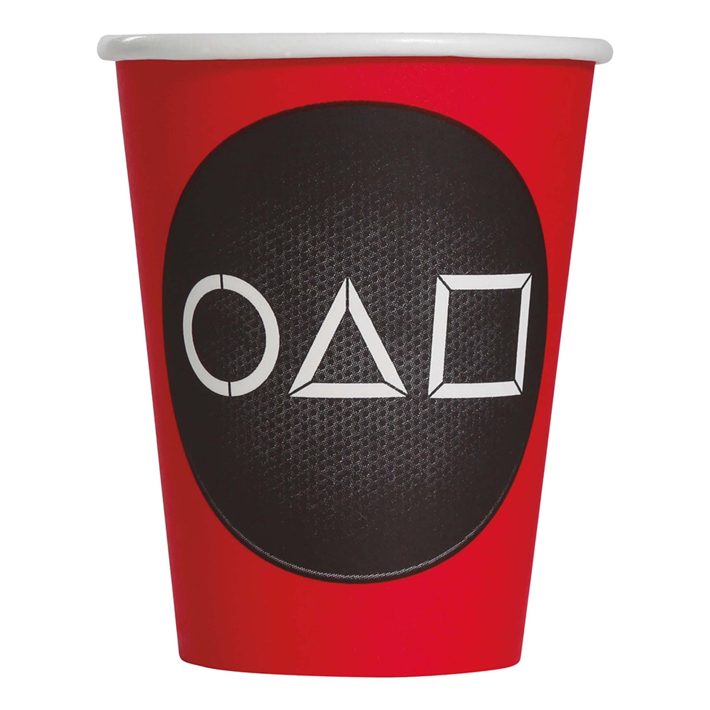 Pappersmuggar The Gamer inkluderar sex stycken pappersmuggar i rött med motiv av Squid Games klassiska ikoner: cirkeln, triangeln och kvadraten. Ett givet val att duka fram på bordet på Squid Game festen!