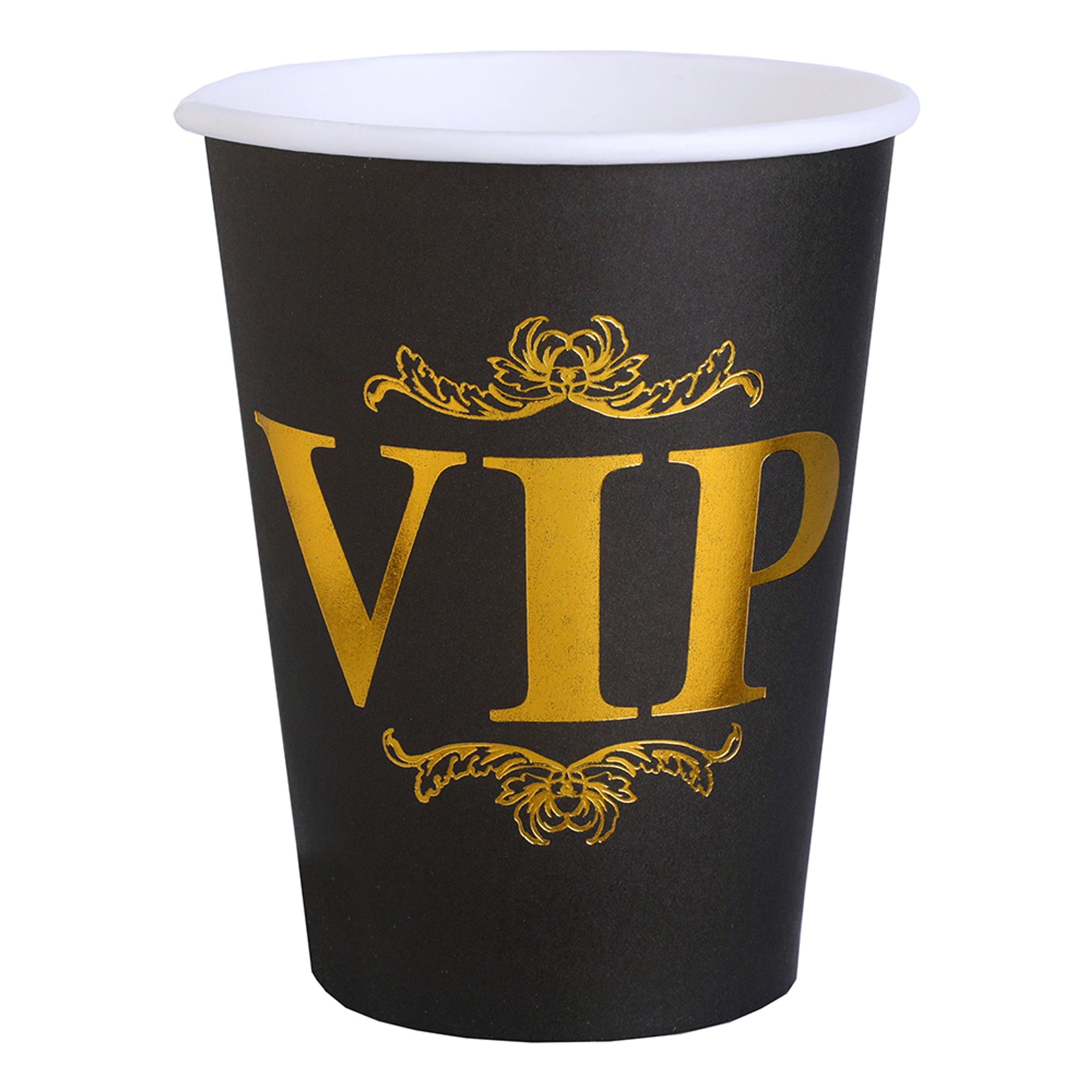 Ståtliga pappersmuggar i svart och guldig färg med texten: "VIP" på. Passar perfekt att dricka lite saft ur på eran topphemliga fest.