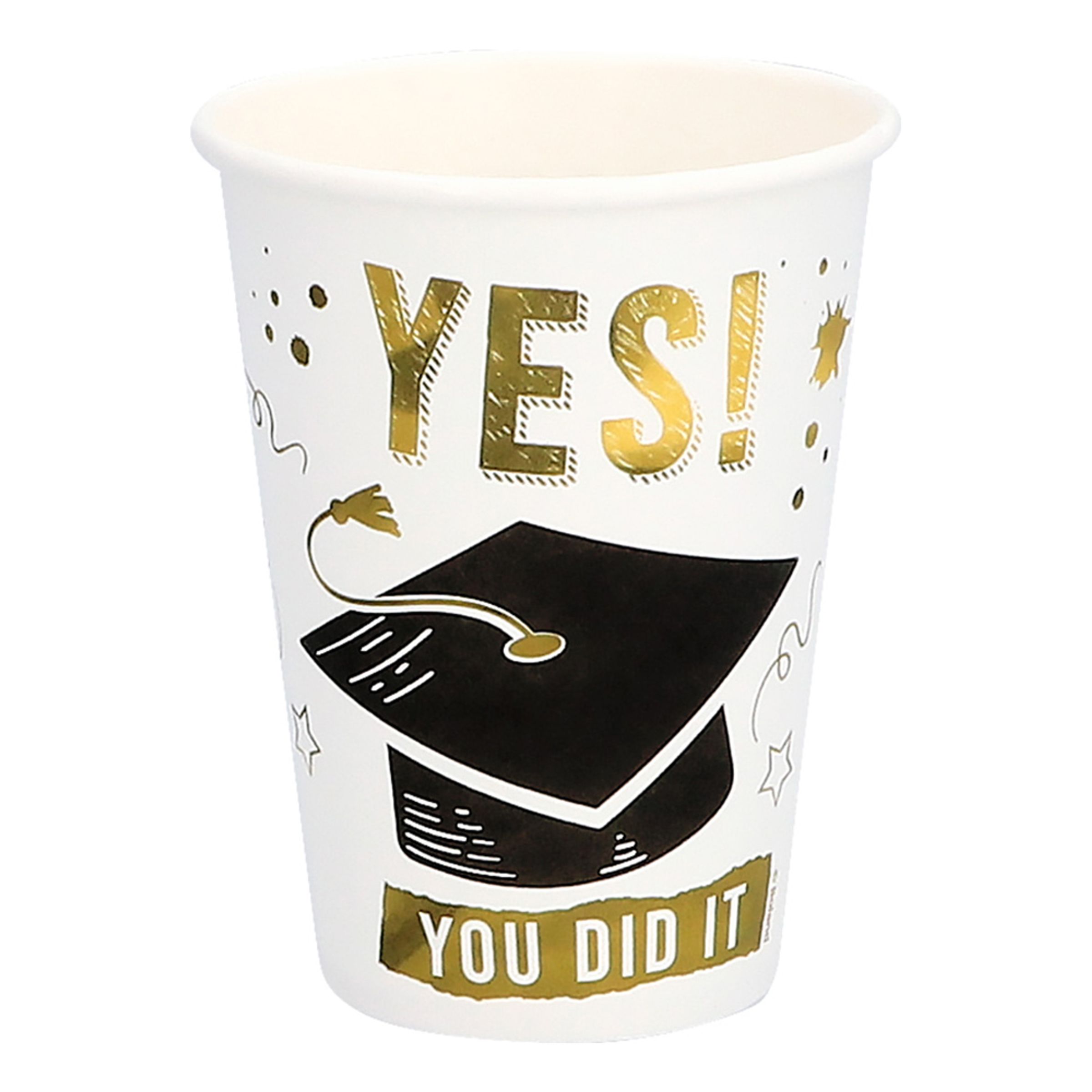 Pappersmuggar Yes! You Did It inkluderar åtta stycken engångsmuggar som kommer med motiv föreställande examenshattar och texten "Yes! You did it". Matcha gärna muggarna med annan dukning ur samma kollektion för ett komplett tema på examensfirandet.