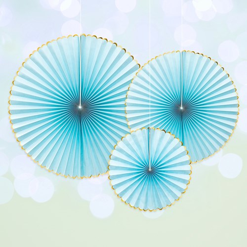 Dessa blå papperssolfjädrar med guldkant säljs i 3-pack, med tre olika storlekar i varje set: 40 cm, 32 cm och 23 cm i diameter.