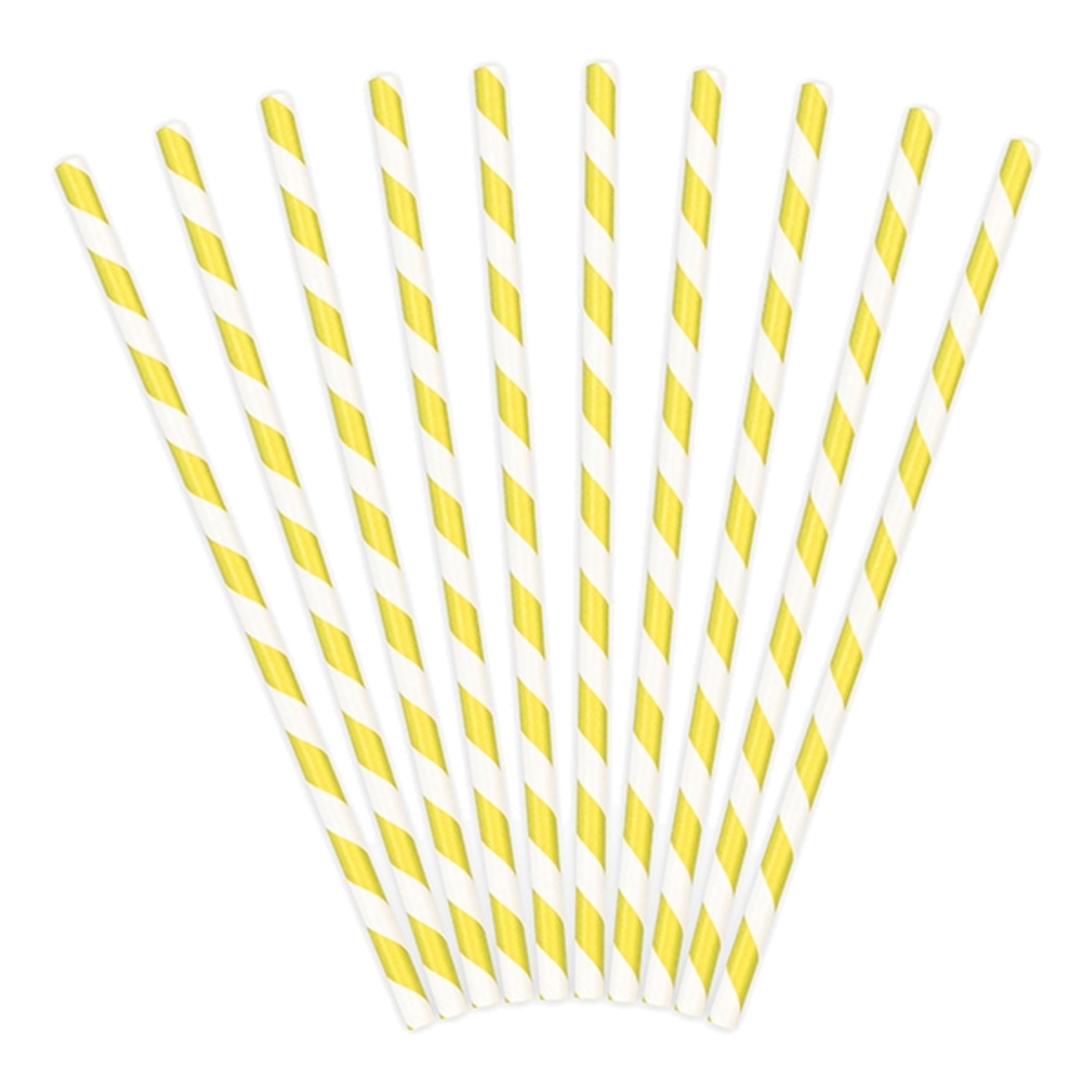 Papperssugrör Gul/Vita är ett 10-pack sugrör i snygg design. Du kommer förmodligen att få beröm av gästerna för din vackra dukning, så sug i dig!