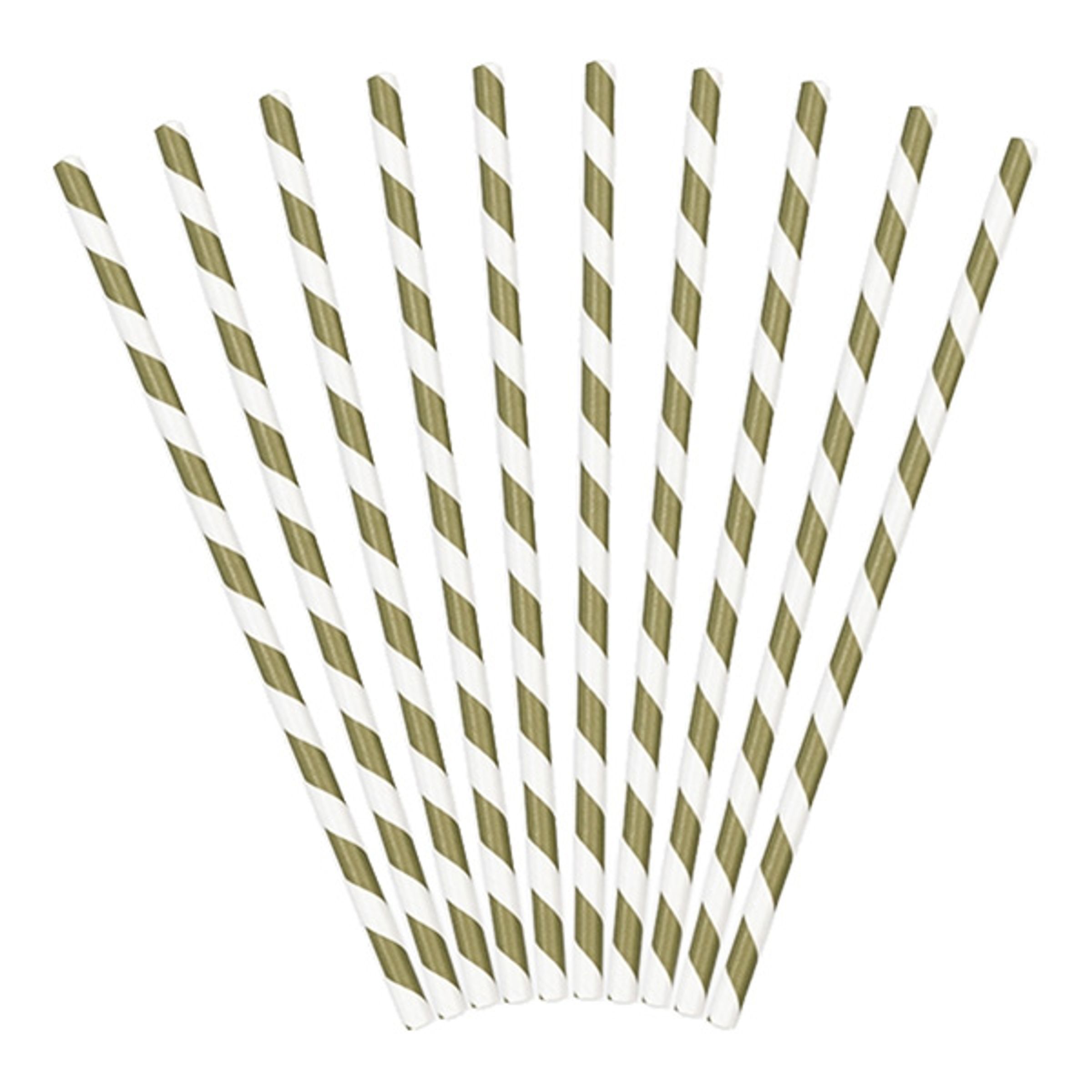 Papperssugrör Guld/Vit Randiga är ett 10-pack rejäla papperssugrör. Sugrören har ett randigt mönster som går i vitt och guld.