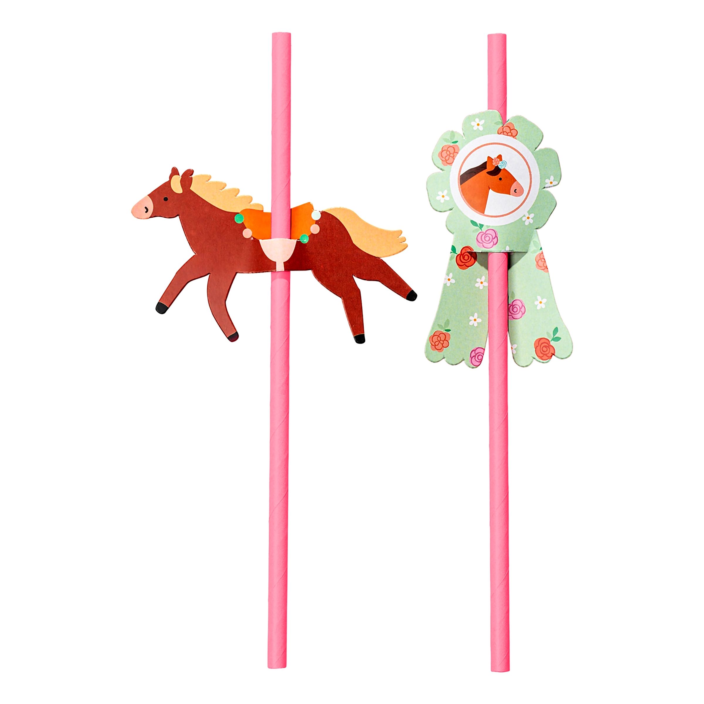 Papperssugrör Hästar inkluderar sex stycken rosa engångssugrör som kommer med två olika hästmotiv. Matcha gärna dukning och dekorationer ur samma kollektion för ett komplett tema på barnkalaset!