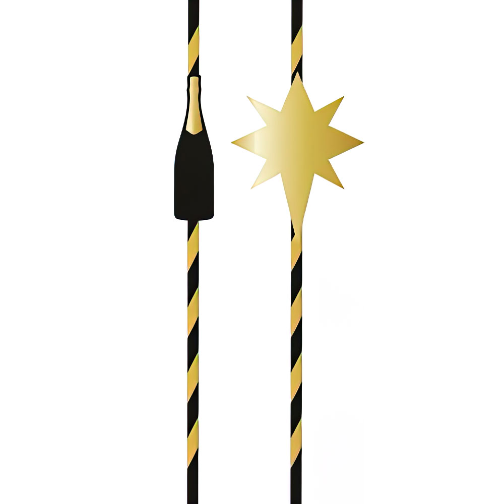 Papperssugrör med Flaskor och Stjärnor omfattar guld- och svartrandiga sugrör i papp med utstickande motiv av stjärnor och champagneflaskor. Sugrören är ca 19, 5 cm långa och säljs i 10-pack.