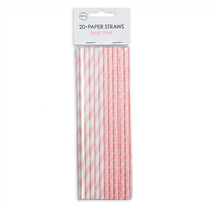 Papperssugrör Mix Ljusrosa omfattar ett 20-pack randiga och prickiga papperssugrör ljusrosa och vitt.