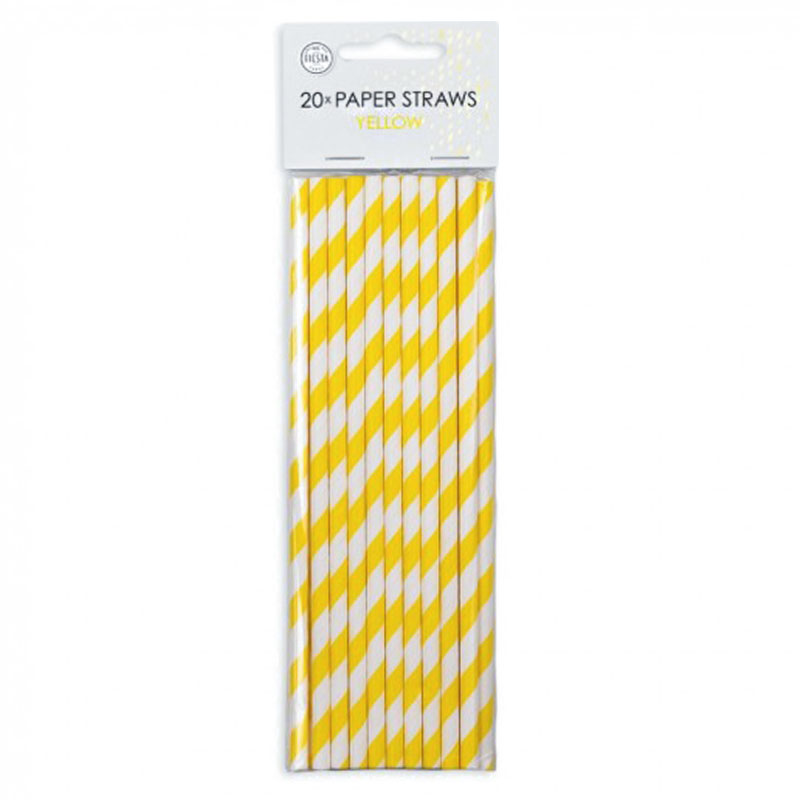 Papperssugrör Randig Gul omfattar ett 20-pack randiga papperssugrör i gult och vitt.