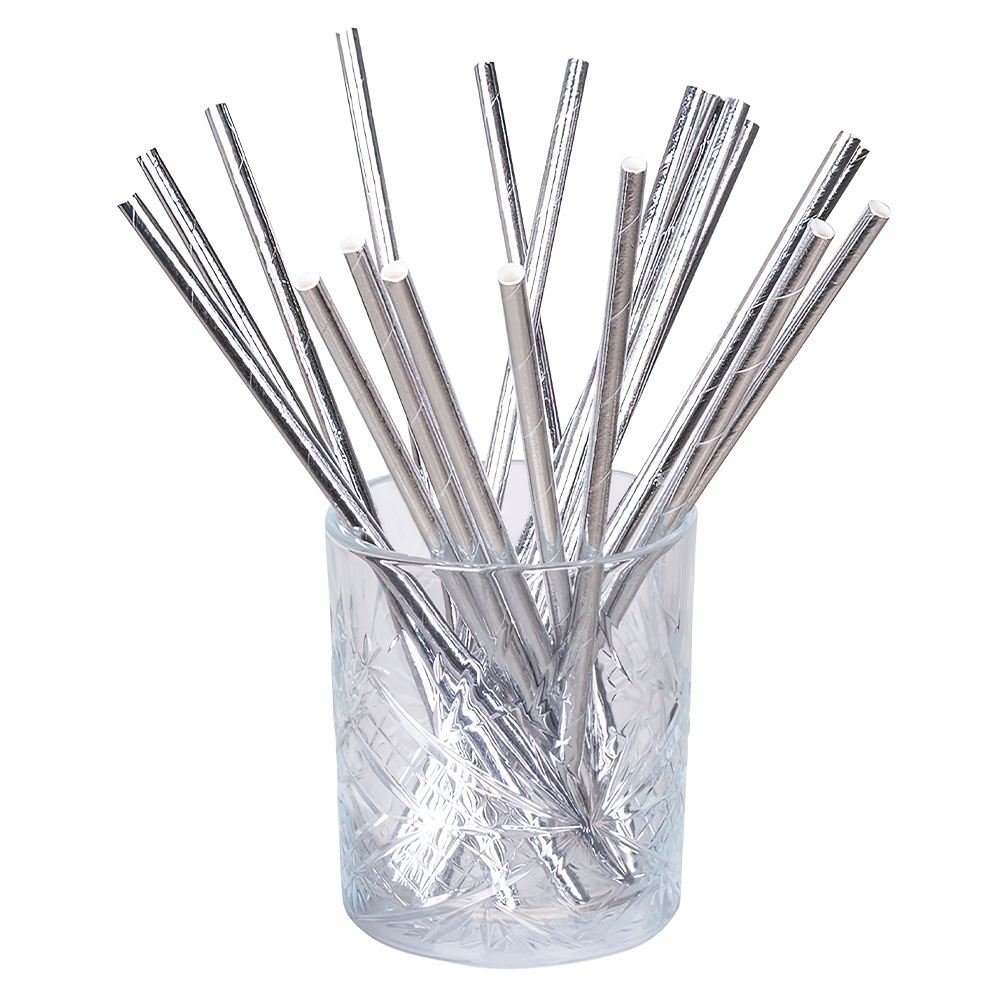 Papperssugrör Silver består av ett paket med 20 stycken sugrör i papper.