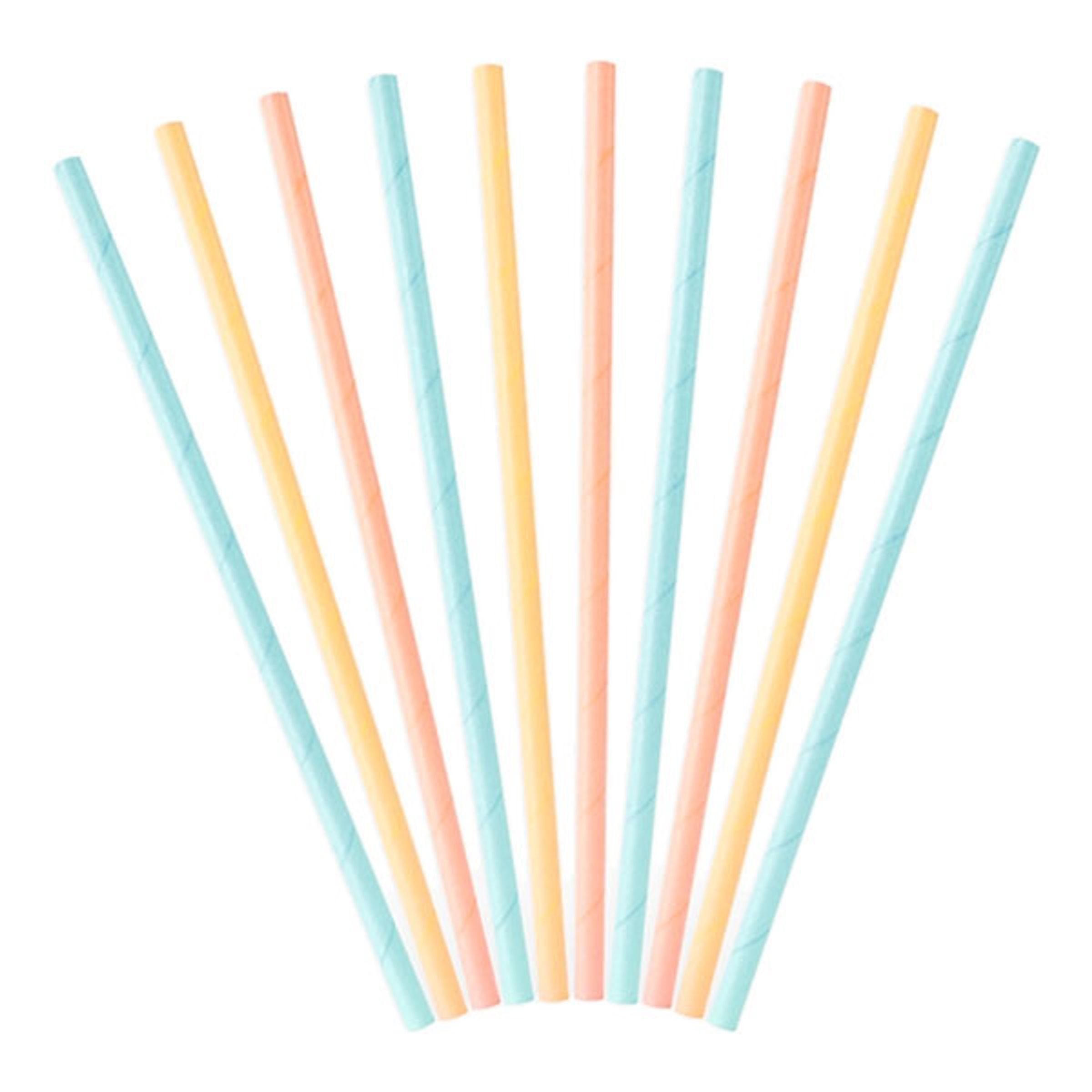 Papperssugrör Sommar är ett 10-pack med papperssugrör i de somriga färgerna turkos, gul och persika. De är ett utmärkt tillbehör för en sommar- eller födelsedagsfest. Matcha gärna med dukning i pastellfärger.