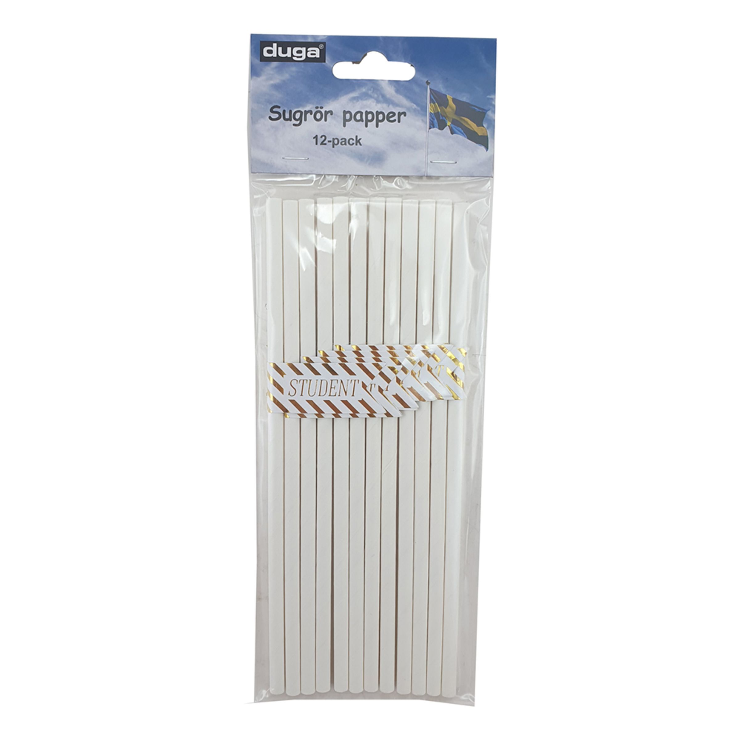 Papperssugrör Studenten inkluderar tolv stycken vita sugrör dekorerade med en liten bricka i vitt och guld med texten "student". Sugrören är tillverkad i papp.