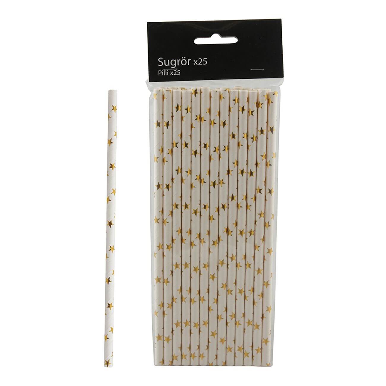 Fina papperssugrör som är vita med guldstjärnor. Perfekta till kalaset eller festen. Förpackningen innehåller 25 sugrör.