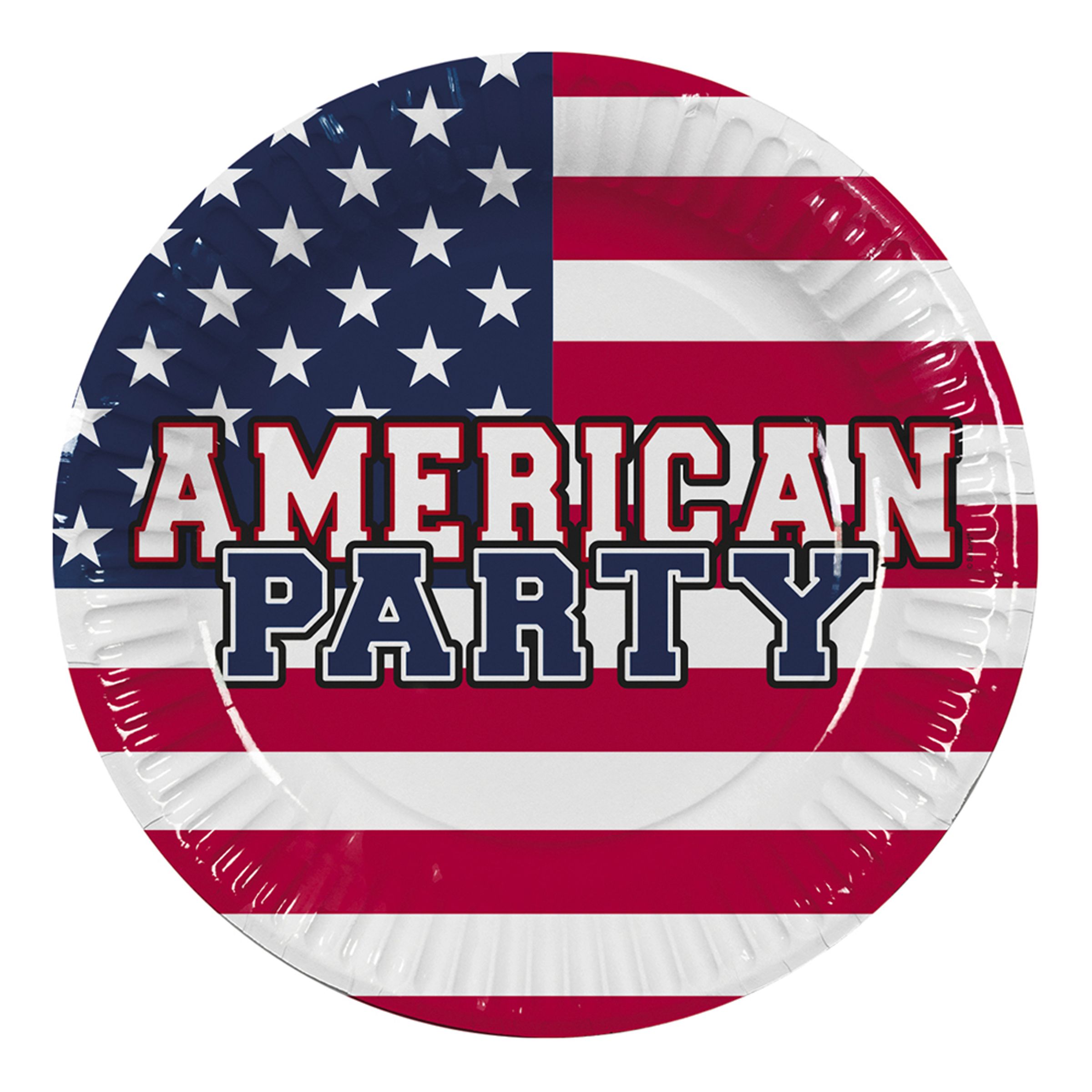 Papperstallrikar American Party är engångstallrikar i papper som passar utmärkt om du ska ha en amerikansk fest. Papperstallrikarna har en amerikansk flagga och texten "American Party" i klassiska röda, vita, blåa-färger precis i enlighet med USA-temat!