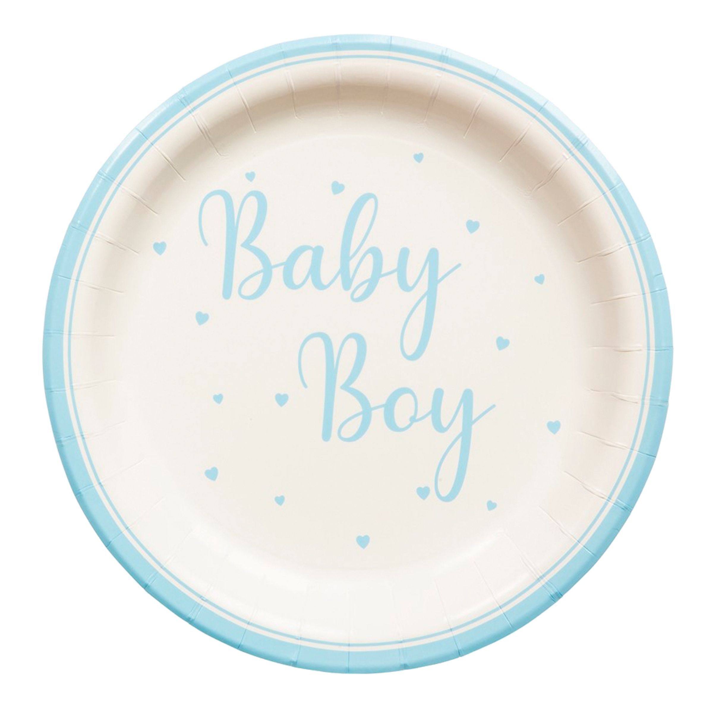 Papperstallrikar Baby Boy Ljusblå inkluderar åtta stycken vita tallrikar med ljusblå kant och små gulliga hjärtan på. Mitt på tallriken står det "Baby Boy" i blå text. Perfekt till Baby Showern!