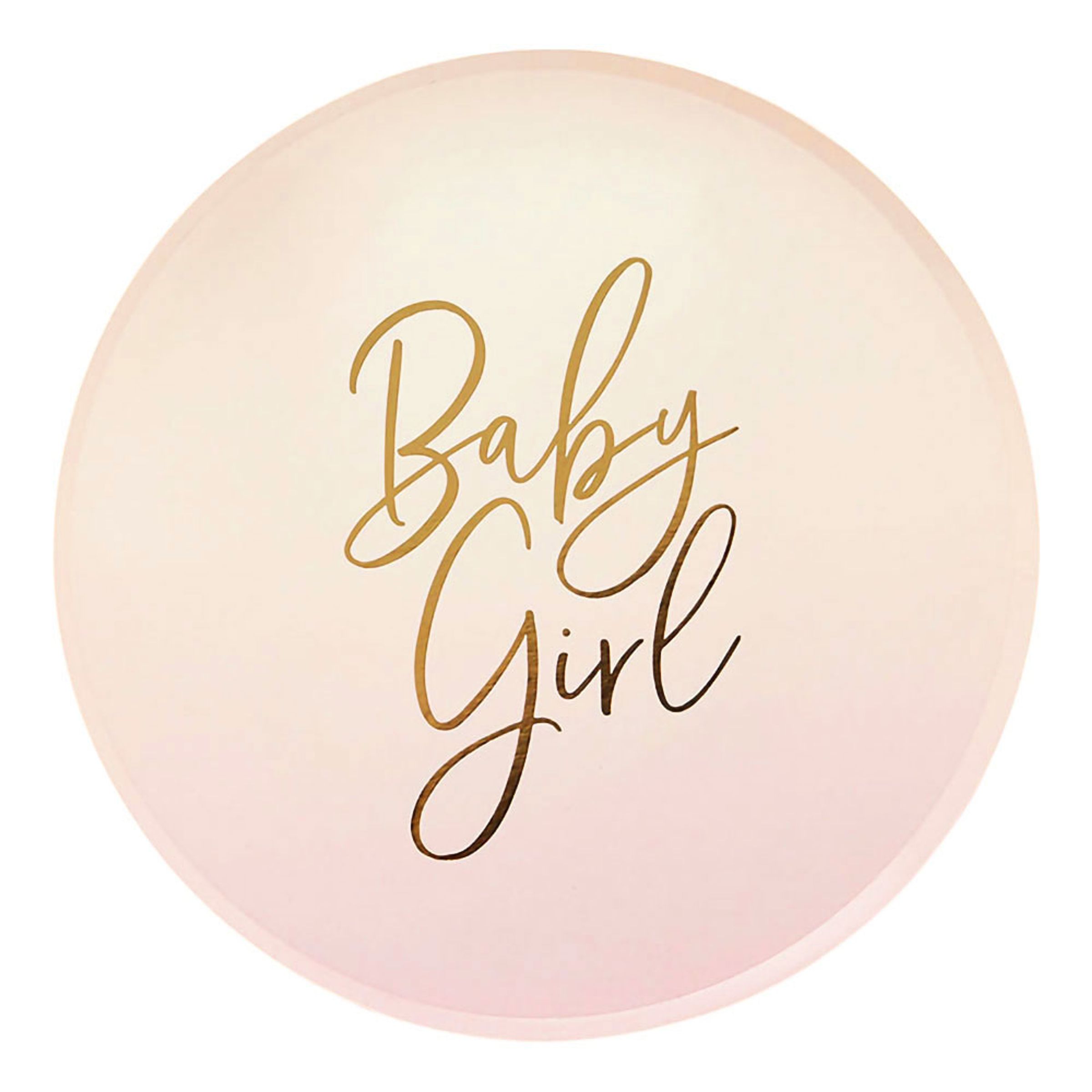 Papperstallrikar Baby Girl Ljusrosa inkluderar åtta stycken engångstallrikar som kommer med en ljusrosa toning över halva tallriken, samt texten "Baby Girl" skrivet i guldfärg. Tallrikarna passar dessutom utmärkt att matcha med annan dukning ur samma kollektion för ett komplett tema på kommande baby shower.