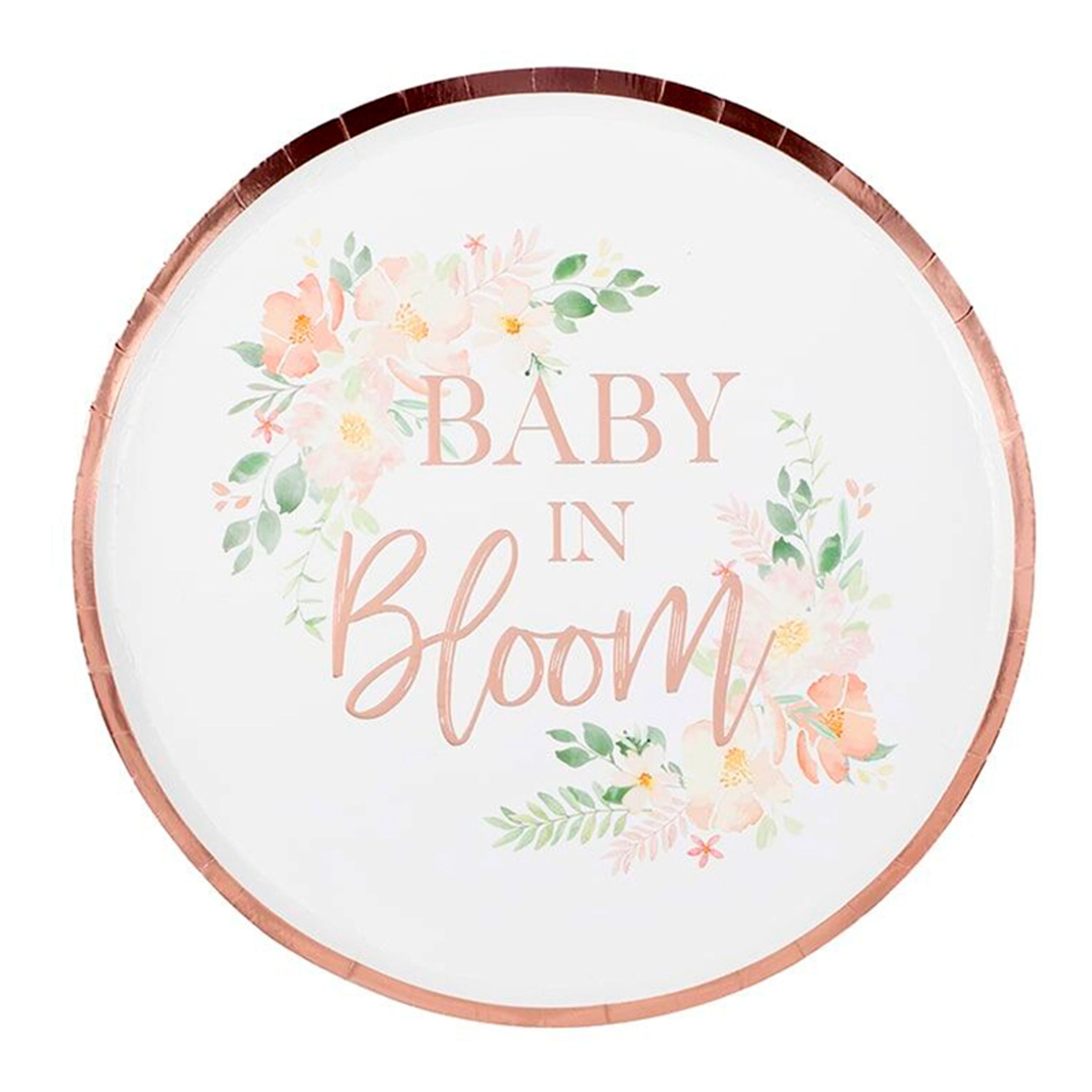 Papperstallrikar Baby In Bloom Roséguld innehåller 8 stycken tallrikar i papper med roséguldsfärgade kanter. Varje tallrik mäter 24,5 cm och pryds av texten "Baby In Bloom".