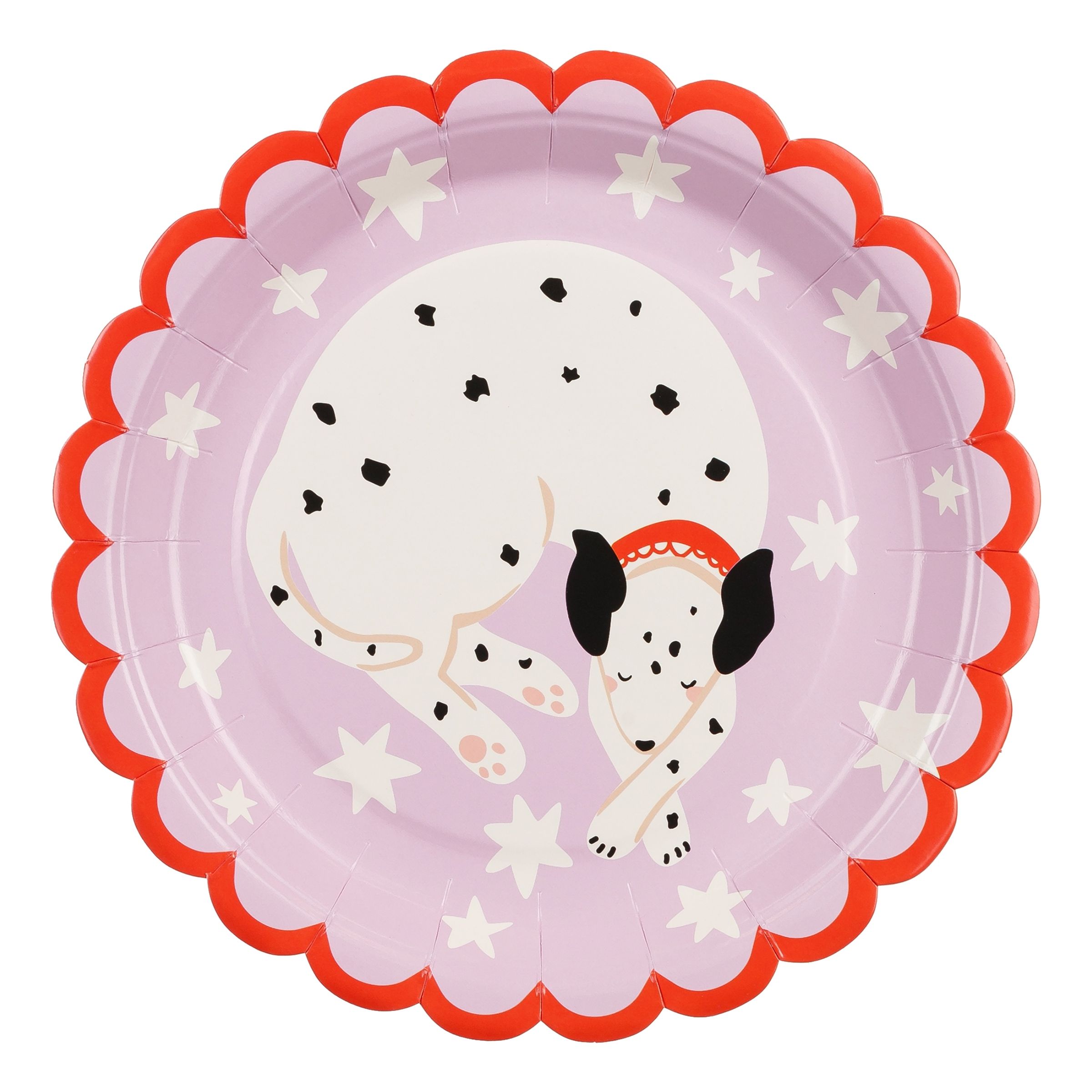 Papperstallrikar Dalmatiner inkluderar sex stycken tallrikar i papp med motiv av en vilande Dalmatiner. Komplettera gärna med annan dukning och dekorationer ur samma kollektion för ett fullbordat hund-tema på barnkalaset.