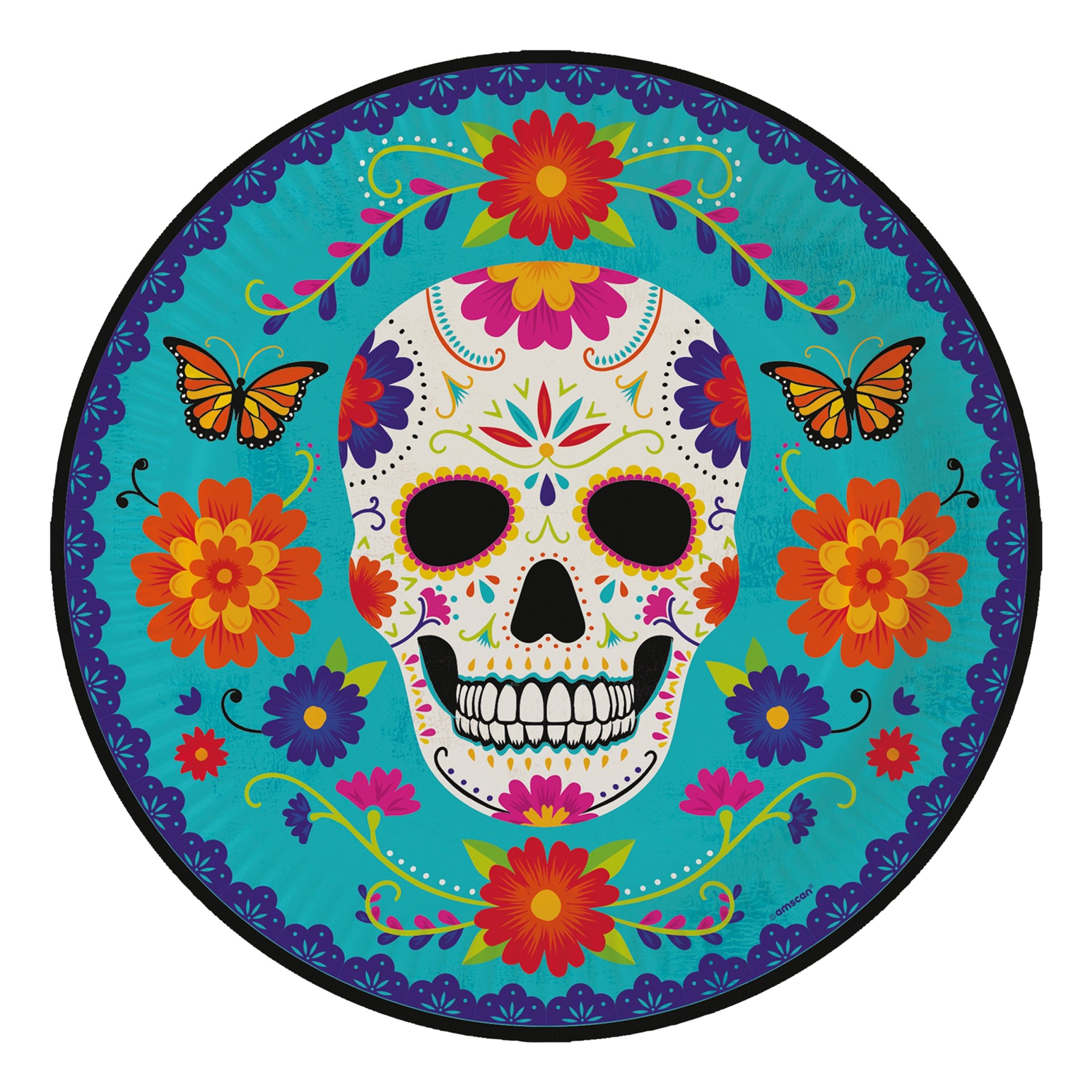 Papperstallrikar Day of the Dead inkluderar totalt åtta stycken engångstallrikar av papper som kommer med ett klassiskt Day of the Dead-motiv föreställande en dödskalle med turkos bakgrund. Matcha gärna med annan dukning ur samma serie för ett fullbordat tema.