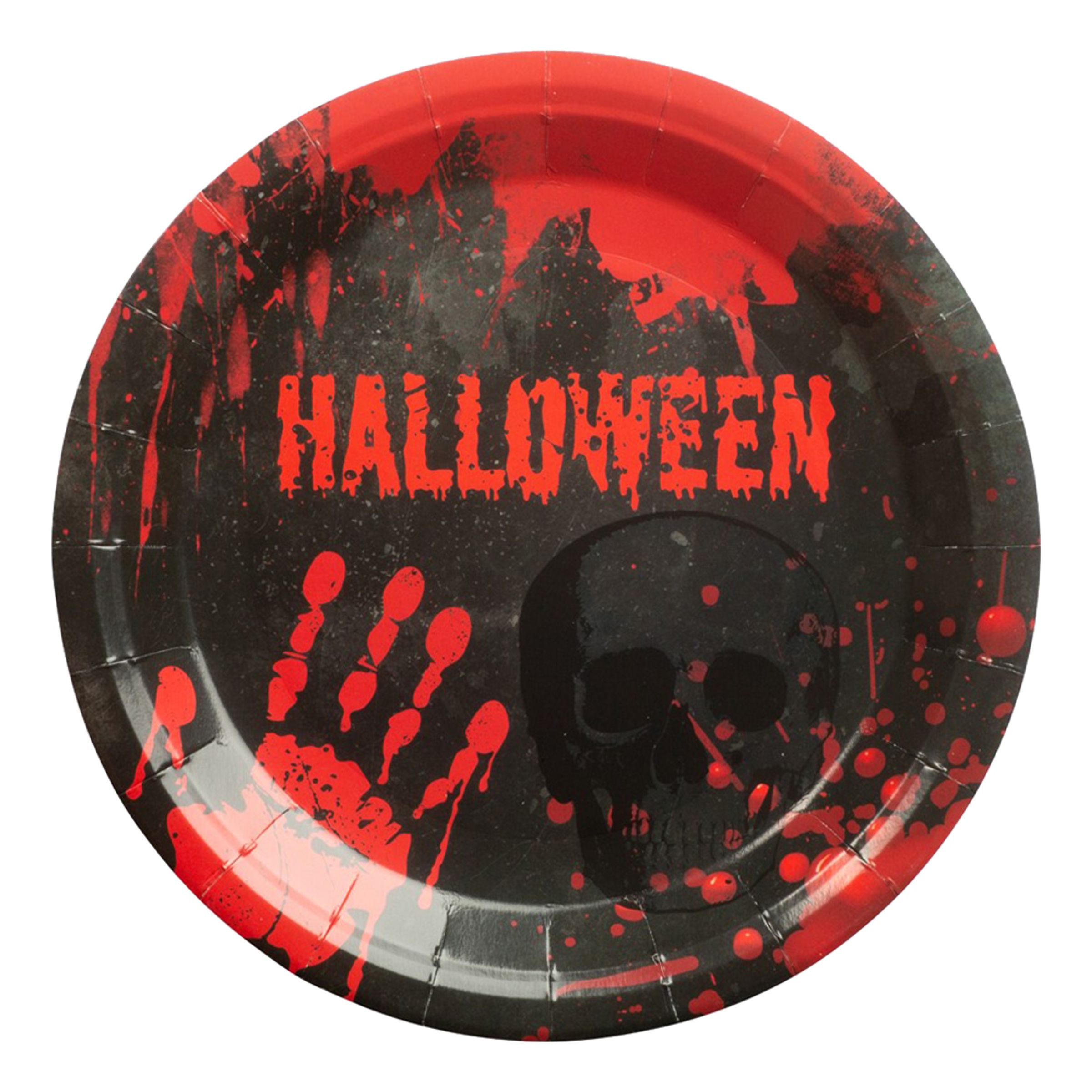 Papperstallrikar Dödskallar är runda papptallrikar i svart och rött med motiv av en blodig hand och en fadead dödskalle, tryckt med texten "Halloween" i rött. Creepy som få!