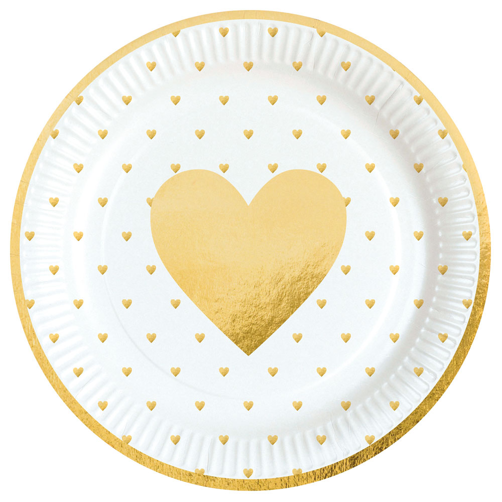 Papperstallrikar Everyday Love omfattar ett 8-pack vita engångstallrikar med guldiga hjärtmotiv och guldiga kanter. Tallrikarna är tillverkade av papp och mäter ca 23 cm i diameter.