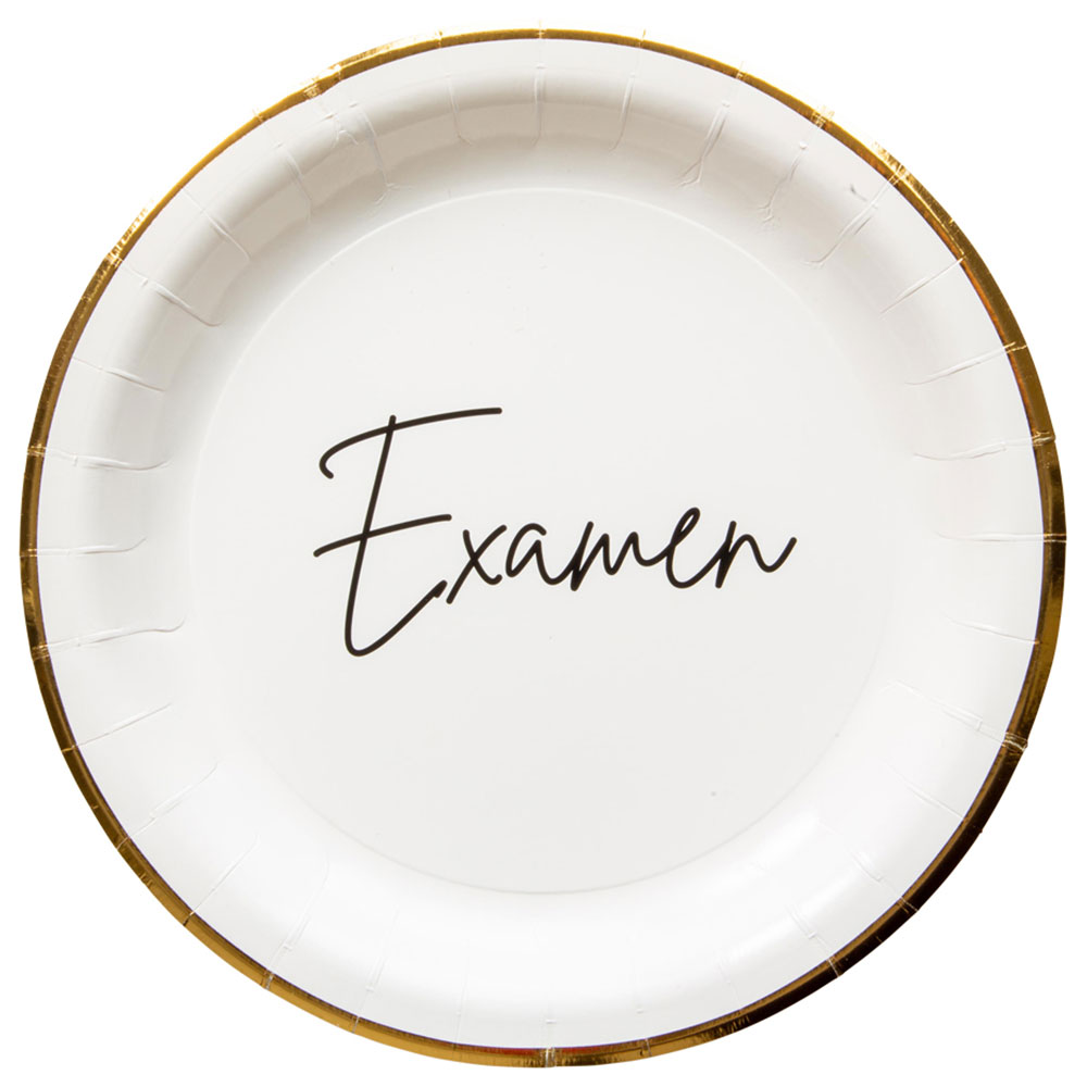 Papperstallrikar Examen 8-pack består av åtta vita engångstallrikar som är dekorerade med en kant i metallic guld samt texten "Examen" i svart.
