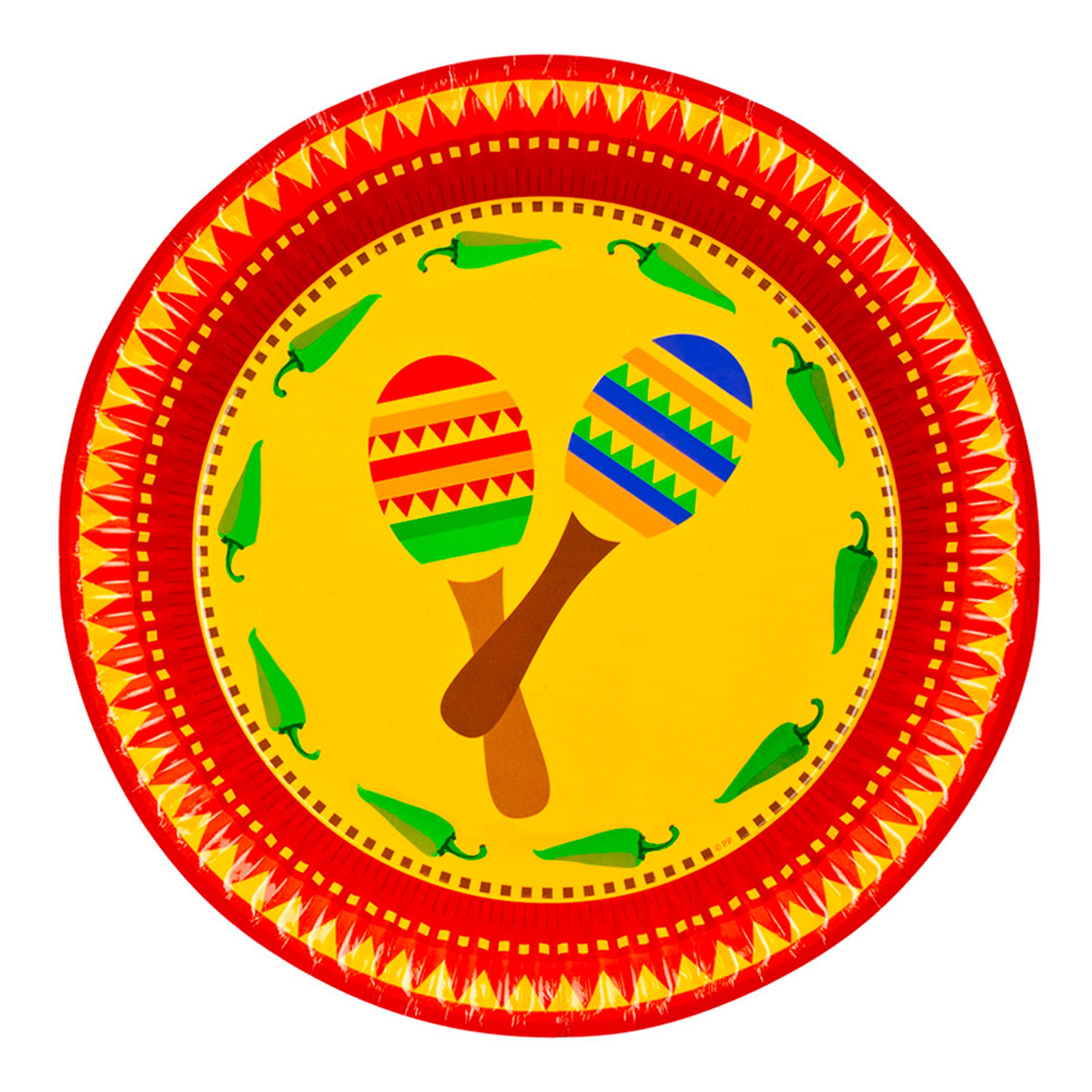 Papperstallrikar Fiesta är tio stycken engångstallrikar i papper som passar utmärkt in i latino-temat. Färgerna är klassiskt gul och röd med bilder av sombreros och chilifruktar.