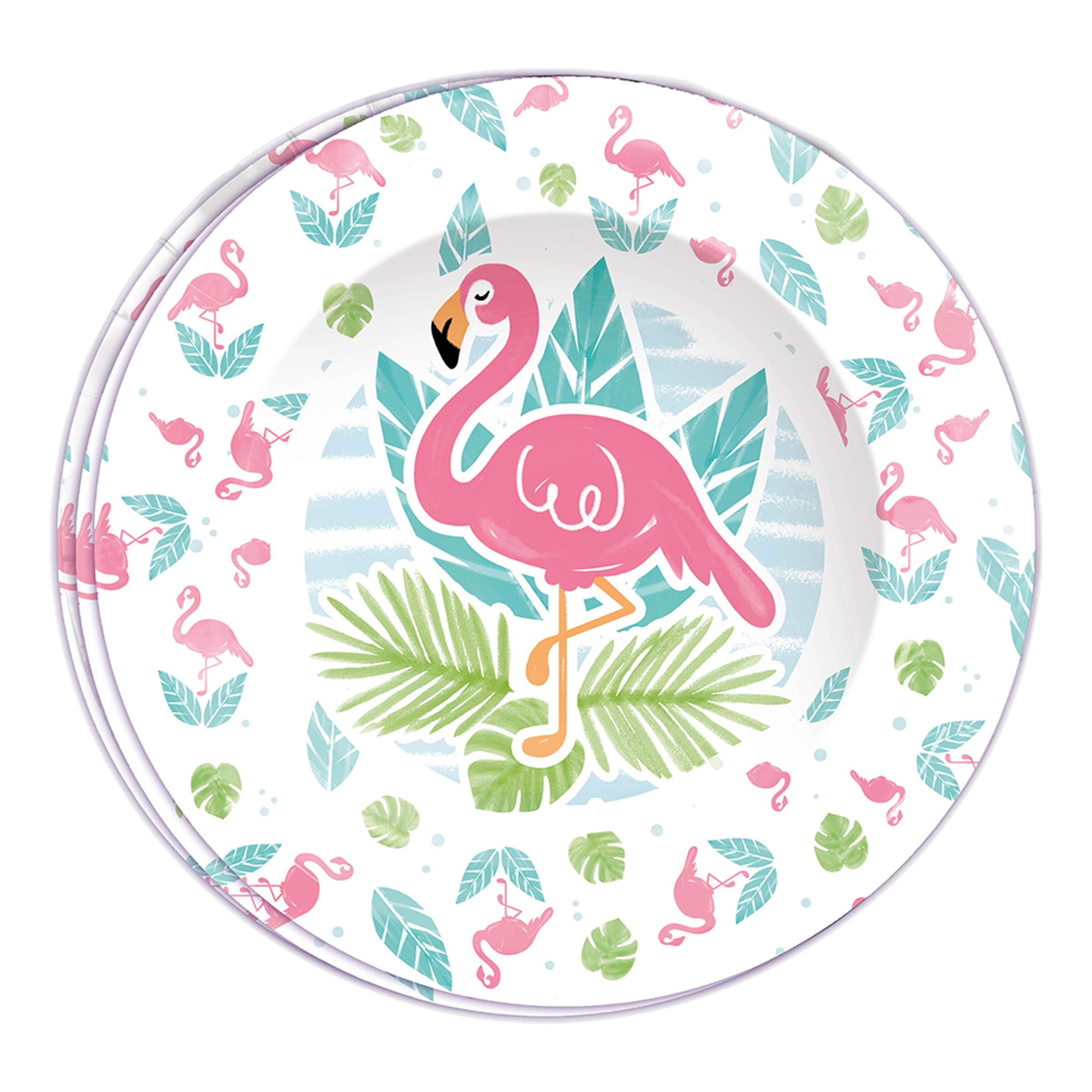Papperstallrikar Flamingos är tallrikar med motiv föreställande rosa flamingos och växter i färgerna turkos och grön. Perfekt till kalaset när du inte vill använda dina vanliga porslinstallrikar!