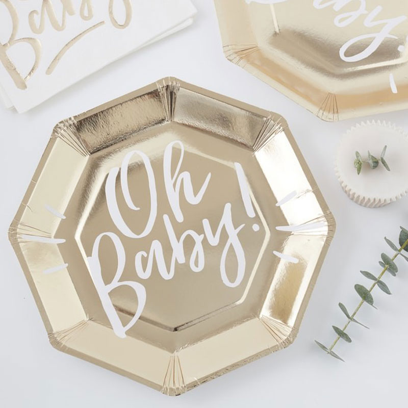 Papperstallrikar Guld Oh Baby innehåller 8 stycken guldiga engångstallrikar med vit "Oh Baby" text i mitten. Perfekta tallrikar till en baby shower. Tallrikarna är tillverkade i papp.