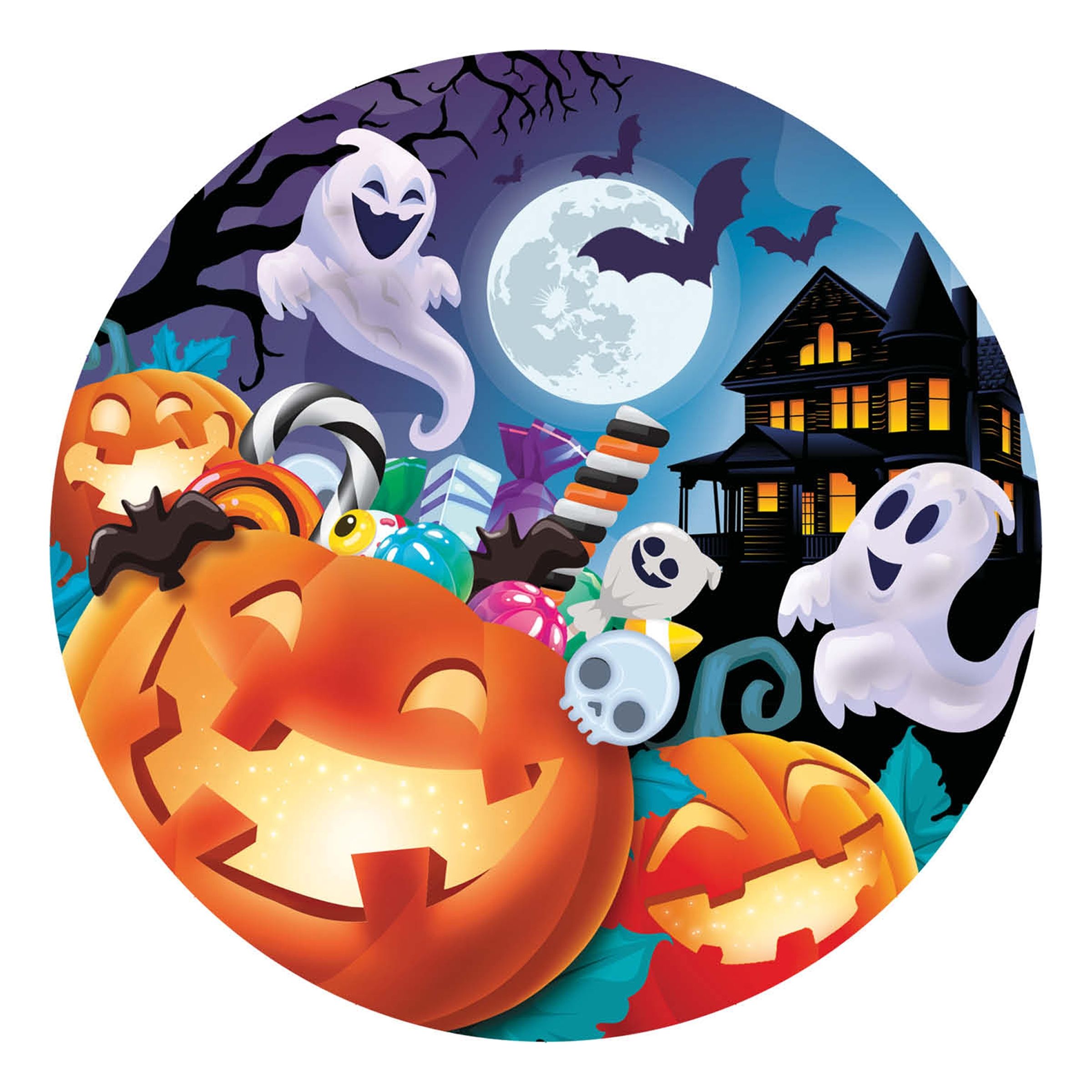 Tänk att få gå på ett riktigt kusligt kalas och äta en ruskigt god tårta på en superläbbig tallrik som pryds av spöken och pumpor med godis. Det vore väl något, det!