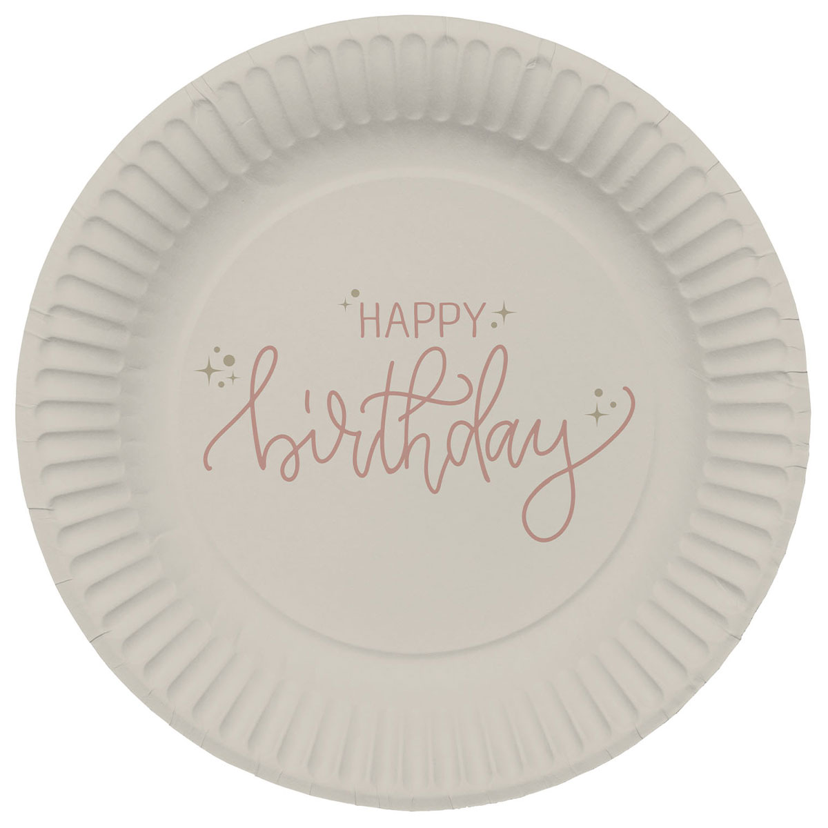 Papperstallrikar Happy Birthday Krämvit/Krämrosa 8-pack består av åtta engångstallrikar, dekorerade med gnistrande stjärnor och texten "Happy Birthday" i krämrosa mot en krämvit bakgrund.