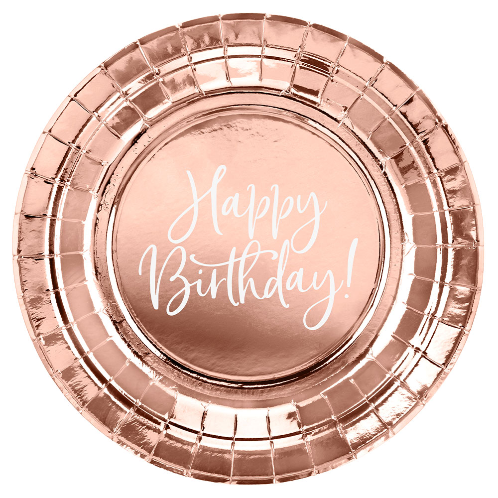 Servera födelsedagstårtan med stil på snygga tallrikar i sköna toner av roséguld. Fina papperstallrikar som passar bra in på en födelsedagsdukning med en känsla av glamour, och som med ett glatt Happy Birthday sprider en riktig födelsedagsstämning.