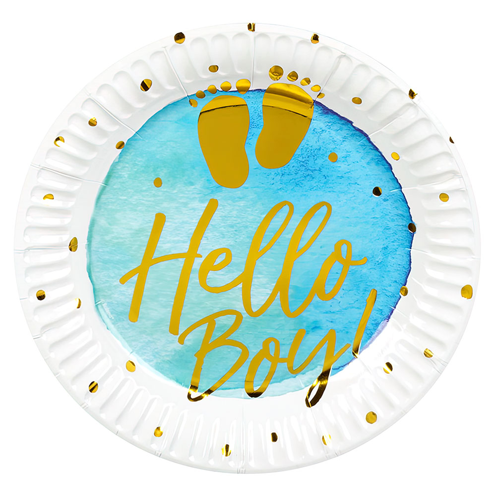Dessa papperstallrikar är dekorerade med en blå bakgrund med texten "Hello Boy" och ett par söta små fötter i guld. Engångstallrikar är perfekta till festen då man slipper diska efteråt och bara kan slänga dom i närmaste återvinningskärl efter att babyshowern är slut. Så du hjälper inte bara miljön utan underlättar även för dig själv med dessa tallrikar.